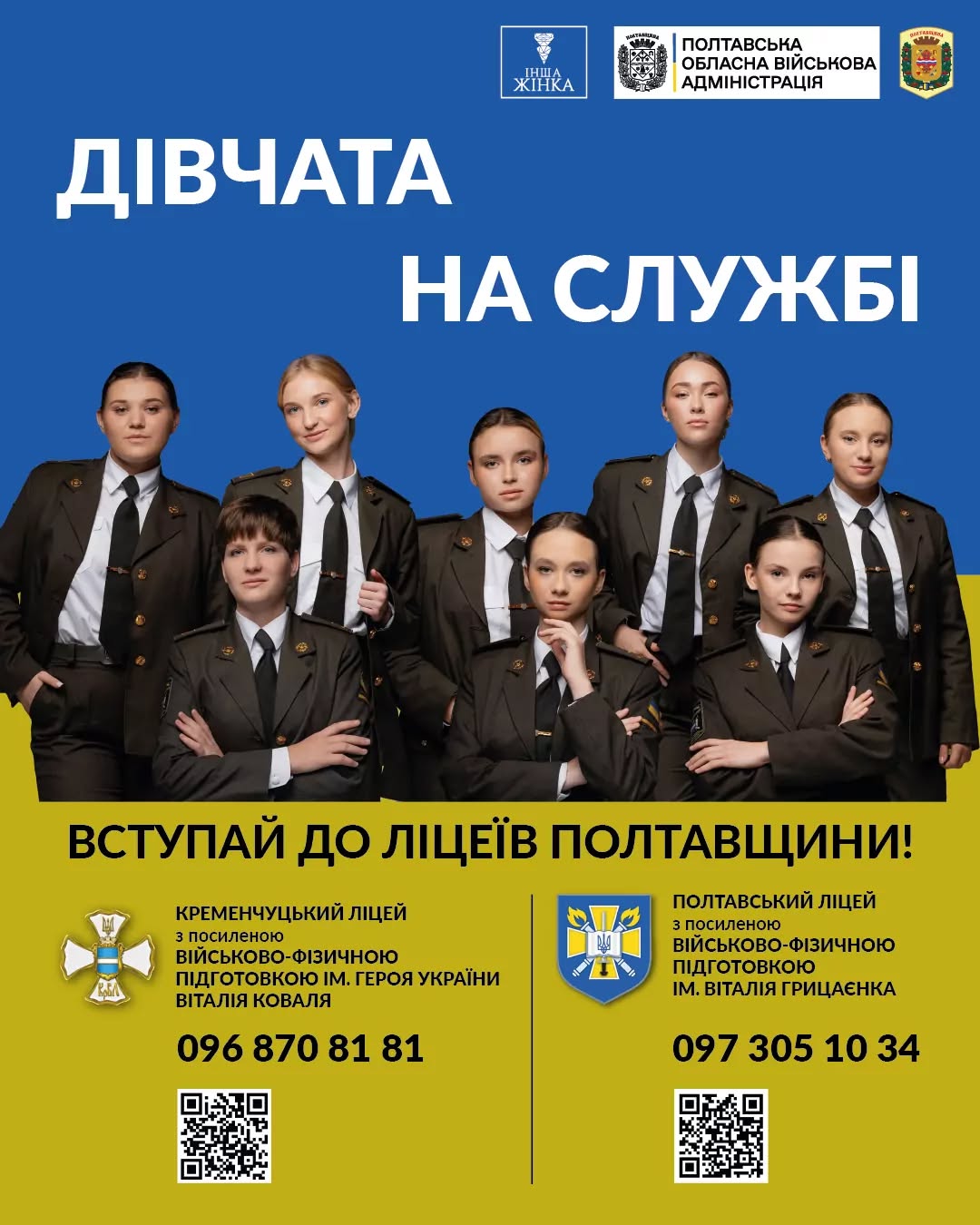 Стартує масштабна обласна рекламна кампанія, спрямована на залучення дівчат до навчання в ліцеях Полтавщини з посиленою військово-фізичною підготовкою. Організаторами виступають громадська організація “Інша Жінка” у співпраці з Кременчуцьким та Полтавським ліцеями, Департаментом освіти і науки Полтавської обласної державної адміністрації та Полтавською обласною військовою адміністрацією.