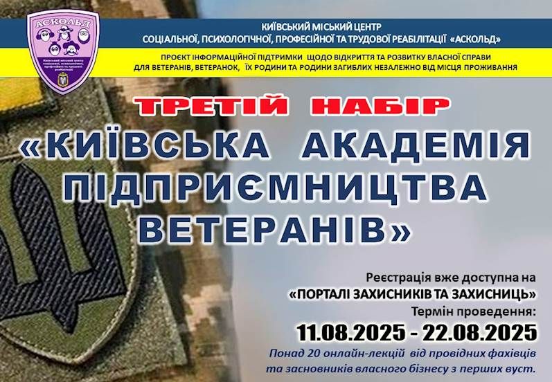 Розпочато третій набір на безкоштовний онлайн-курс «Київська академія підприємництва ветеранів», організований Київським міським Центром реабілітації “Аскольд”. Ця освітня ініціатива призначена для ветеранів, членів їхніх родин, а також родин загиблих захисників, які прагнуть розпочати або розвинути власний бізнес. Курс надасть комплексні знання, необхідні для успішного старту та ведення підприємницької діяльності.