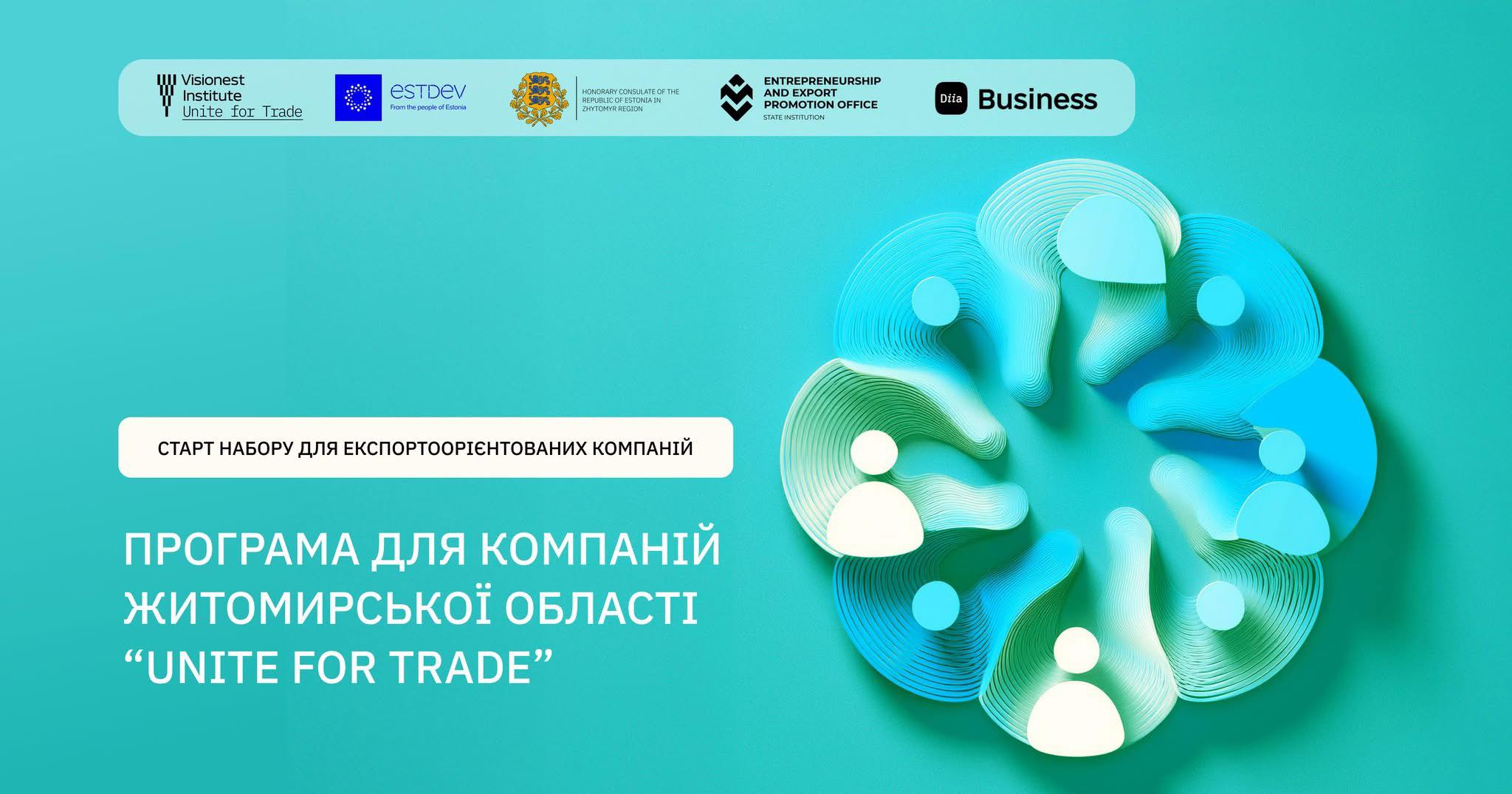 Програма Unite for Trade розроблена та впроваджується Visionest Institute (Estonia) у співпраці з Офісом з розвитку підприємництва та експорту в межах національного проєкту Дія.Бізнес та Почесним консульством Естонської республіки в м.Житомир. Фінансування здійснює ESTDEV — Estonian Centre for International Development.