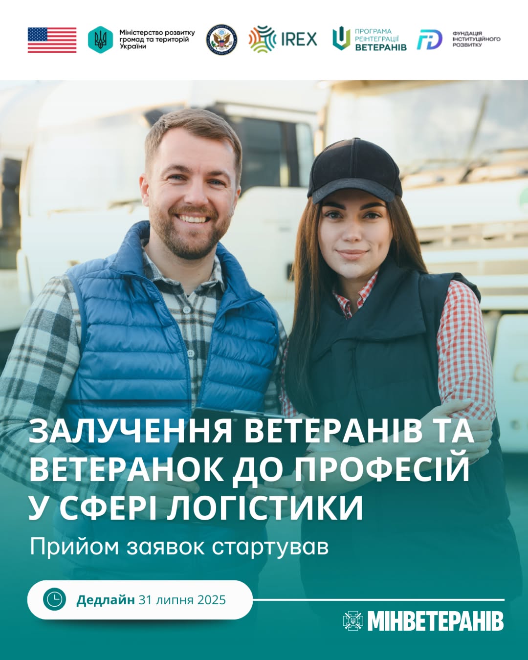 ℹ️ Цей важливий проєкт «Залучення ветеранів до професій у сфері логістики» реалізується громадською організацією «Фундація інституційного розвитку» у співпраці з Міністерством розвитку громад та територій України. Він також здійснюється за сприяння Програми реінтеграції ветеранів, яку втілює IREX in Ukraine за фінансової підтримки Державного департаменту США (U.S. Department of State).