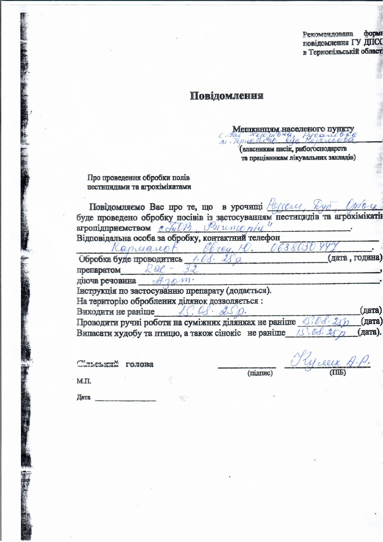 З 1 серпня, у вечірній час, за сприятливих погодних умов, на полях, розташованих поблизу сіл Гаї Ходорівські, Русанівка, а також у районі вулиці Корольова, буде проводитися важлива процедура внесення мінерального добрива КАС. Це необхідний етап для підтримки родючості ґрунтів та забезпечення майбутнього врожаю.