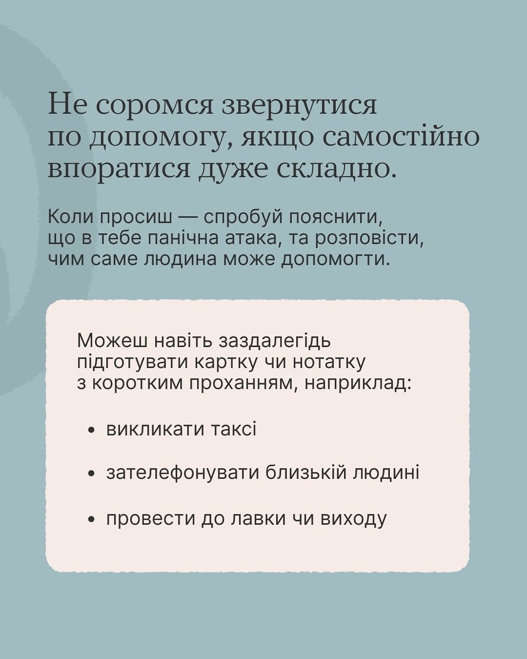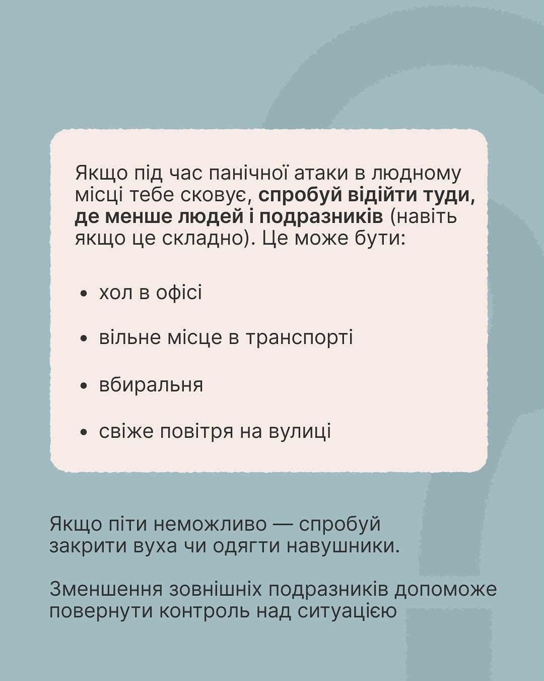 Важливо також нагадати собі, що панічна атака не є небезпечною для життя, хоча й може викликати сильний страх. Це реакція вашого тіла на стрес, і вона пройде. Спробуйте відволіктися, увімкнувши музику, розмовляючи з кимось або займаючись чимось, що вимагає концентрації.