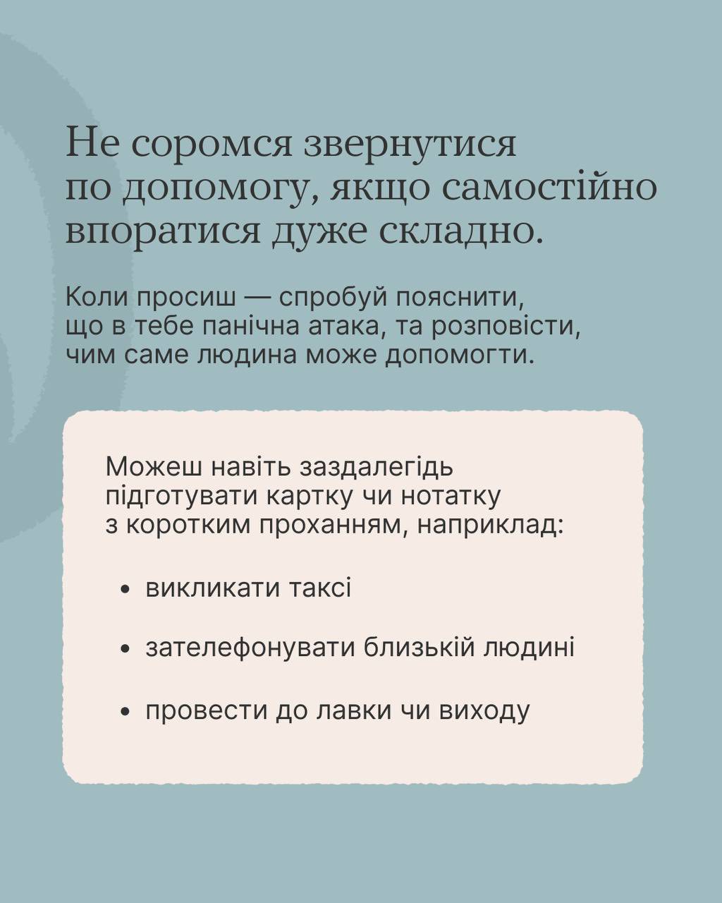 Важливо пам’ятати, що підтримка близьких може бути дуже цінною. Якщо ви довіряєте комусь поруч, попросіть про допомогу або просто скажіть, що вам недобре. Їхня присутність та слова підтримки можуть значно полегшити стан.