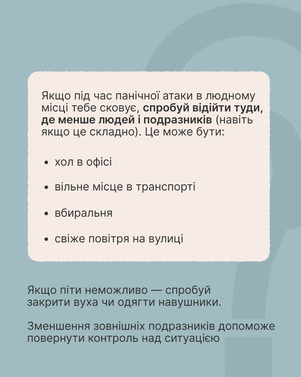 Якщо є можливість, відійдіть у тихе місце, де вас ніхто не турбуватиме. Це може бути вбиральня або просто куток, де менше людей. Спокійне оточення сприятиме швидшому відновленню.