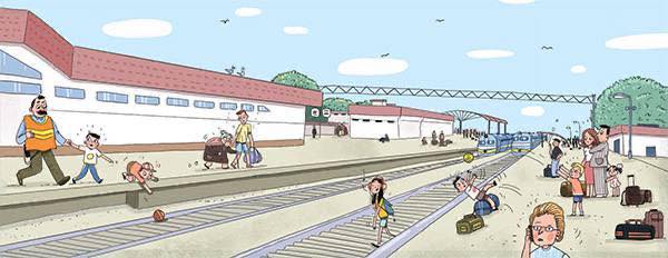 2.1. Переходити колії дозволяється лише у визначених місцях: пішохідні мости, переходи, тунелі, переїзди. На станціях без мостів і тунелів – використовуйте обладнані настили з відповідними покажчиками.