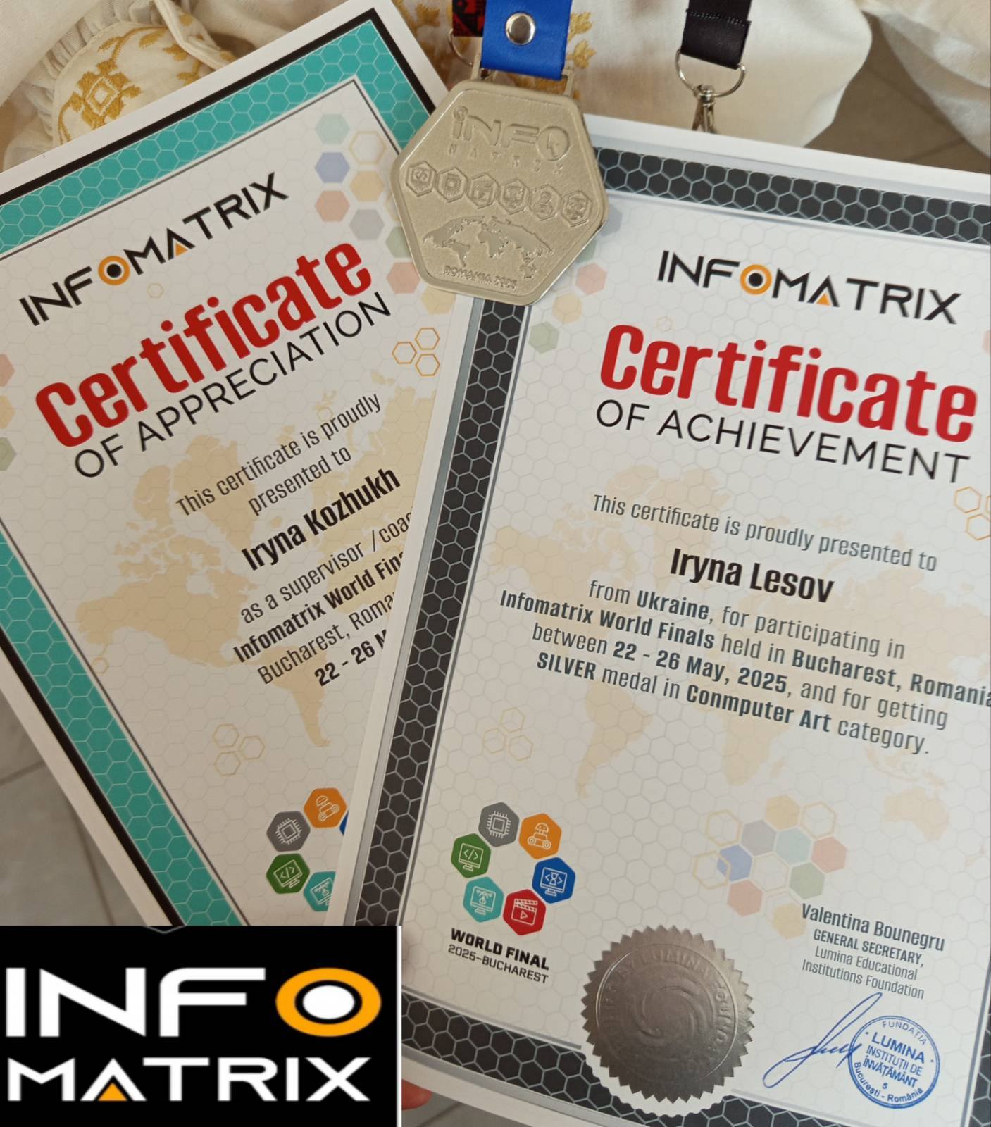 Шлях до перемоги був нелегким. Спочатку Ірина Лесов здобула перемогу на національному етапі конкурсу. Після цього, вона пройшла тривалу та інтенсивну підготовку до світового фіналу. У Румунії, на суперфіналі InfoMatrix 2025, Ірина Лесов гідно представила Україну та виборола срібну нагороду, підтвердивши високий рівень української освіти та інноваційного потенціалу.