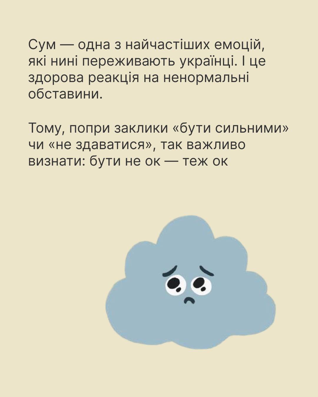 Смуток – це природна емоція, яка виникає у відповідь на втрати, розчарування або складні життєві обставини. В умовах постійного стресу і невизначеності, які ми переживаємо зараз, сумувати – це нормально. Важливо не пригнічувати цю емоцію, а дати собі час і простір для її переживання. Проте, якщо смуток стає занадто інтенсивним або тривалим, необхідно вжити заходів для покращення свого емоційного стану.