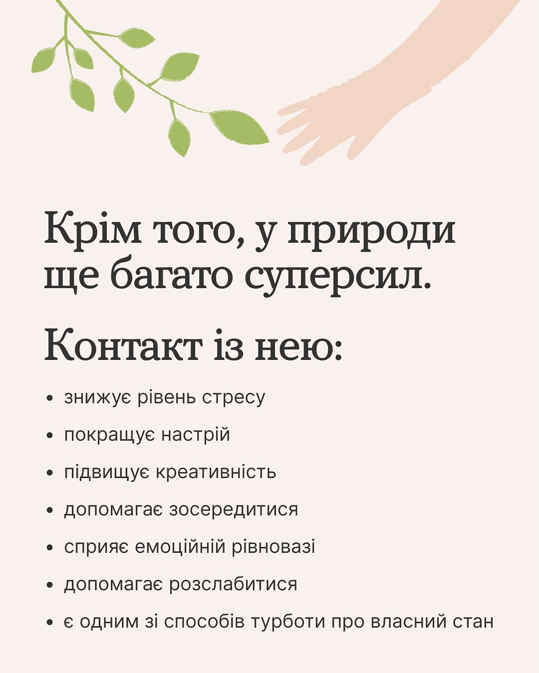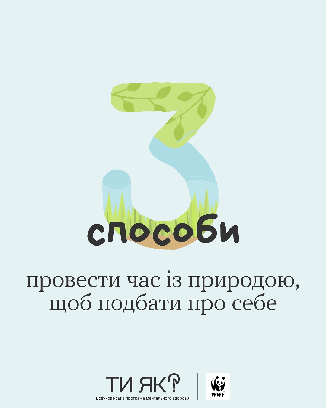 Природа – це безцінне джерело сили та спокою, яка завжди поруч, щоб підтримати нас. Вона безкорисливо дарує нам енергію та допомагає відновити зв’язок із собою, повертаючи до найважливішого – здатності чути власні потреби. У сучасному світі, сповненому стресів та викликів, турбота про ментальне здоров’я стає пріоритетом. Наша внутрішня гармонія залежить від того, наскільки ми уважні до себе та свого стану. Зв’язок із природою є одним із найефективніших способів досягти цієї гармонії. Навіть коротка прогулянка лісом, сидіння біля водойми чи просто споглядання зелені може суттєво покращити настрій і знизити рівень тривожності. Природа має унікальну здатність заспокоювати розум і тіло, допомагаючи нам відновити сили та знайти внутрішній баланс. Команда «Ти як?» спільно з WWF-Україна пропонує три прості, але дієві практики, які допоможуть вам подбати про себе, використовуючи силу природи. Ці практики розроблені для того, щоб інтегрувати турботу про себе у ваше повсякденне життя, роблячи його більш усвідомленим та збалансованим. Ознайомтеся з ними, гортаючи карусель, та оберіть той метод, який найбільше резонує з вашими потребами. Важливо пам’ятати, що турбота про себе – це не егоїзм, а необхідність для підтримки як власного добробуту, так і здатності допомагати іншим. Діліться своїм досвідом у коментарях: який спосіб взаємодії з природою найкраще сприяє вашому ментальному здоров’ю? Ваші відгуки допоможуть іншим знайти свої шляхи до гармонії.