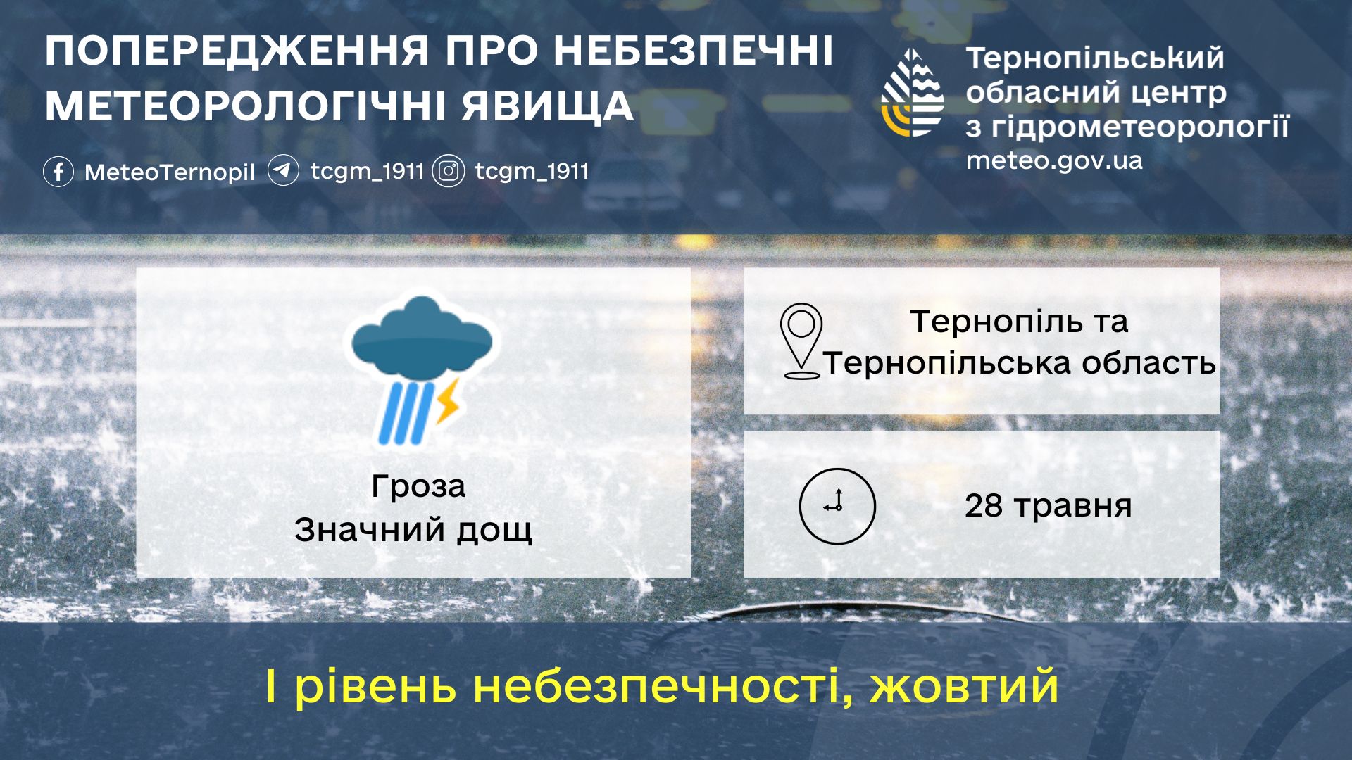За даними гідрометеорологічного центру, 28 травня на території Тернопільської області прогнозуються значні дощі, кількість опадів сягатиме 15 – 49 мм. В селенебезпечних районах області очікується 15 – 29 мм опадів. Крім того, вдень можливі грози, що може ускладнити ситуацію на дорогах та збільшити ризик надзвичайних ситуацій.