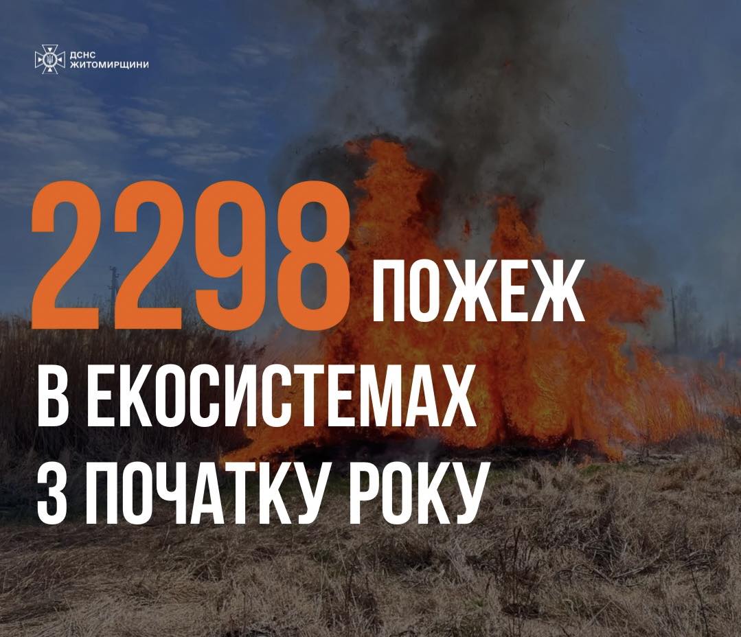 Попри постійну профілактичну роботу та застереження, пожежі сухої рослинності на Житомирщині не припиняються. Від початку року вже зафіксовано 2298 випадків, вогонь знищив понад 2600 гектарів території.