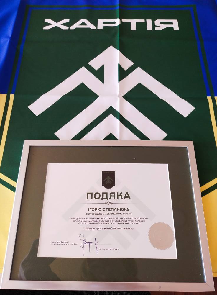 Сьогодні до нашої громади завітала Alina Koval та передала подяку за підтримку “Хартії” та бойовий прапор 13 бригади НГУ “Хартія”.