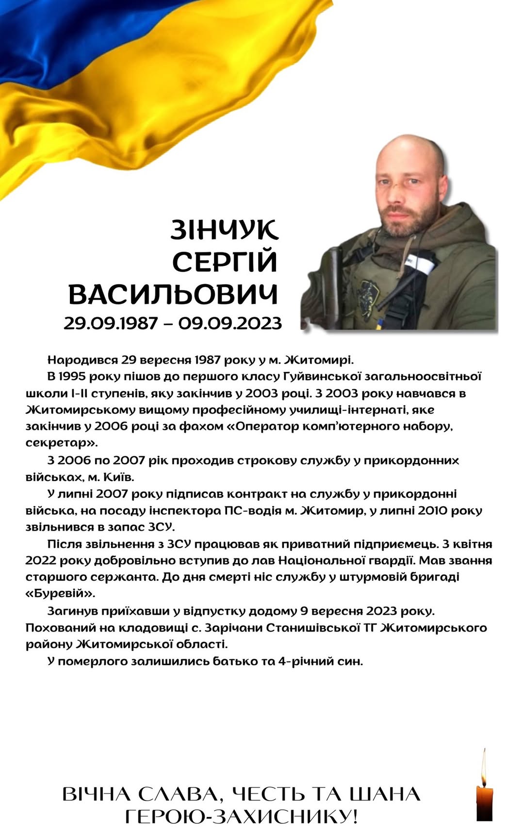 🇺🇦 Друга річниця від дня загибелі Героя Сергія Васильовича Зінчука (29.09.1987 – 09.09.2023) нагадує нам про найвищу ціну, яку платять найкращі сини України за мир та свободу. Ця сумна дата, 9 вересня, стає днем вшанування пам’яті всіх, хто поклав своє життя на вівтар незалежності нашої держави. Сергій Зінчук – один із тих, чия жертовність назавжди викарбувана в історії України.