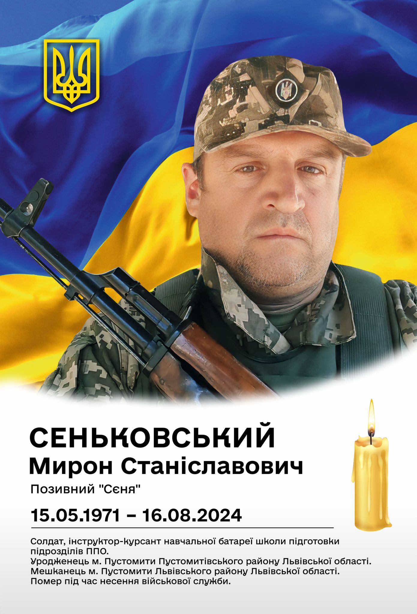 Минає перша річниця від дня, коли 16 серпня 2024 року, під час несення військової служби, обірвалося життя мешканця Пустомитівської громади, уродженця мікрорайону Глинна, Сеньковського Мирона Станіславовича, 1971 року народження. Він віддано служив Українському народу, зарекомендувавши себе як кваліфікований, відповідальний, дисциплінований та працелюбний військовослужбовець. Його вірність військовій присязі є прикладом для всіх нас.