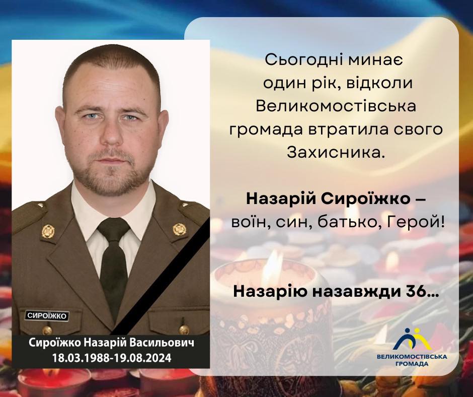 🕯 Рік тому Великомостівська громада вшановує пам’ять свого Захисника — Назарія Сироїжка, який віддав життя за Україну. Назарій народився у мальовничому селі Бутини, де його дитинство та юність пройшли у спокійній атмосфері рідної землі. Після завершення школи, він здобув професію електрогазозварювальника у Львівському професійно-технічному училищі, демонструючи відмінні здібності та працьовитість. Згодом його шлях проліг у будівельну сферу, де він зарекомендував себе як надійний, справедливий та чесний працівник, а також як вірний товариш і друг для багатьох.