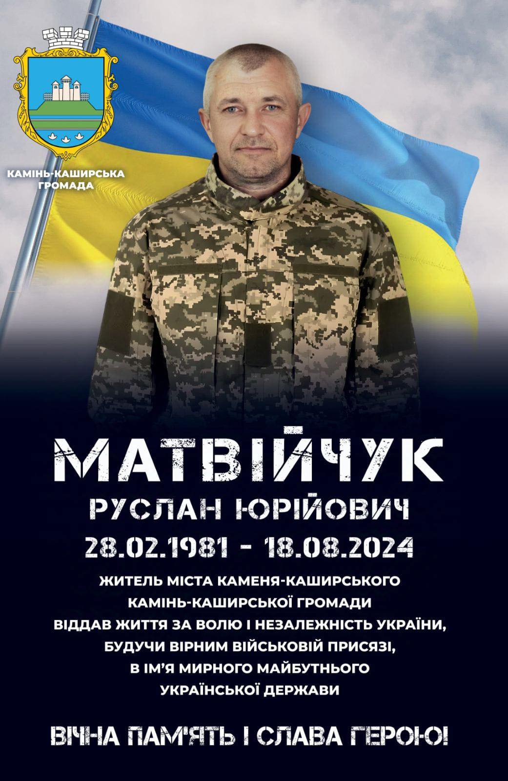 Сьогодні минає рік, як пішов у вічність наш земляк, мужній воїн і вірний син України – Матвійчук Руслан Юрійович із міста Каменя-Каширського. Ця скорбна дата нагадує нам про подвиг Героя, який віддав своє життя заради свободи та незалежності нашої держави. Руслан Юрійович, будучи вірним військовій присязі, пожертвував найціннішим задля мирного майбутнього всіх українців. Його самовідданість і героїзм назавжди залишаться в наших серцях та пам’яті. Ми висловлюємо глибоку шану та вдячність за його мужність, хоробрість та відвагу, проявлені на полі бою.