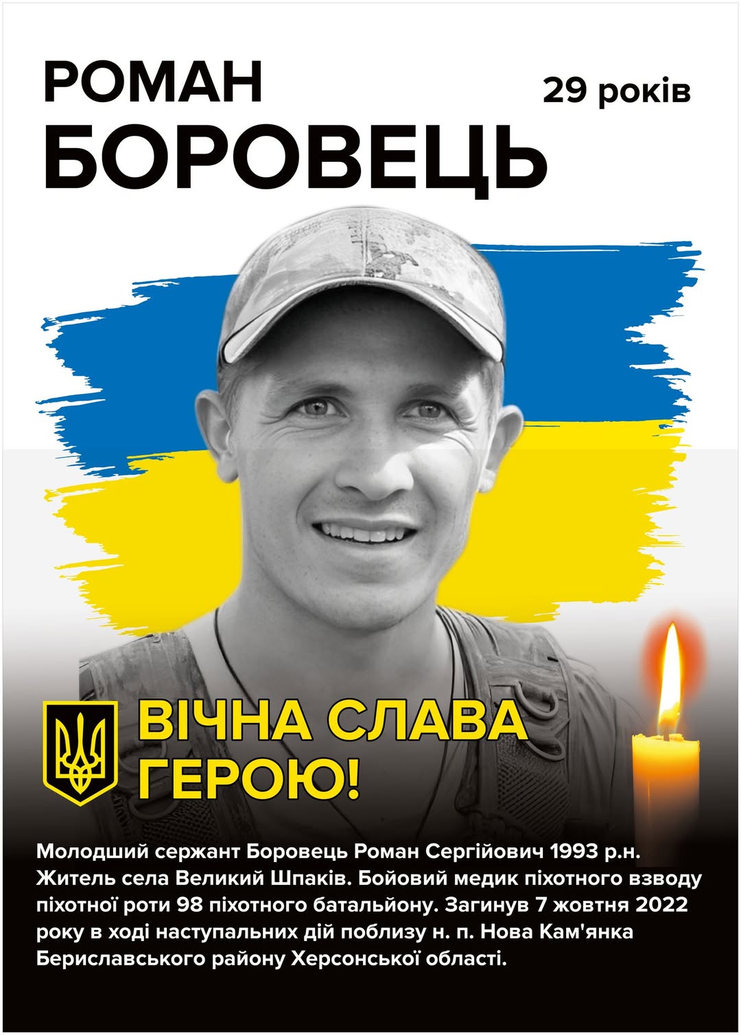 Сьогодні відзначається третя річниця трагічної загибелі Молодшого сержанта Боровця Романа Сергійовича — людини, яка була сином, братом, вірним воїном, відданим медиком, талановитим спортсменом і, безперечно, Людиною з великої літери. Його життя, обірване на 29-му році, назавжди залишиться прикладом мужності та самопожертви.