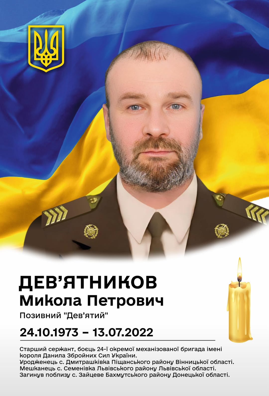 Внаслідок російської агресії, героїчно загинув на території Донецької області – ДЕВ’ЯТНИКОВ МИКОЛА ПЕТРОВИЧ, 24 жовтня 1973 року народження, був зареєстрований та проживав в с. Семенівка