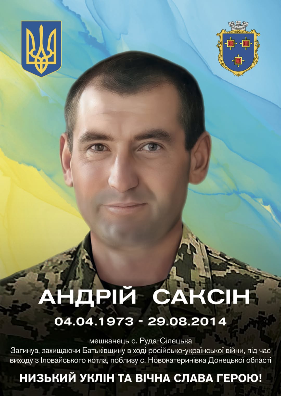 Сьогодні відзначається 11-та річниця трагічних подій, що розгорнулися в Іловайському котлі. Це сумна дата, яка нагадує про героїзм та жертви українських воїнів. Під час виходу за так званим “Зеленим коридором”, на дорозі поблизу села Новокатеринівка, героїчно загинув наш земляк, відважний воїн Андрій Саксін. Його життя, повне надії та планів, обірвала жорстока війна, залишивши глибокий слід у серцях його рідних, побратимів та всієї громади. Андрій Саксін став одним із тих, хто поклав своє життя за свободу та незалежність України. Його мужність, стійкість та незламність духу є прикладом для майбутніх поколінь. Ми схиляємо голови у глибокій скорботі та висловлюємо безмежну вдячність за його подвиг. Пам’ять про таких героїв, як Андрій Саксін, живе вічно, надихаючи нас на боротьбу та єднання. Його ім’я навіки вписане в історію України як символ жертовності та патріотизму. Вічна пам’ять Герою України! Дізнатися більше про життя цього мужнього воїна можна у Книзі Пам’яті за посиланням: https://kbmr.gov.ua/news/1721381365/