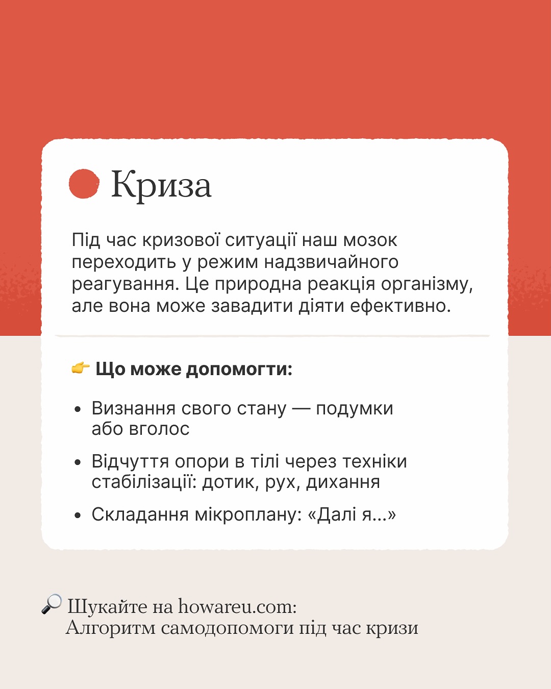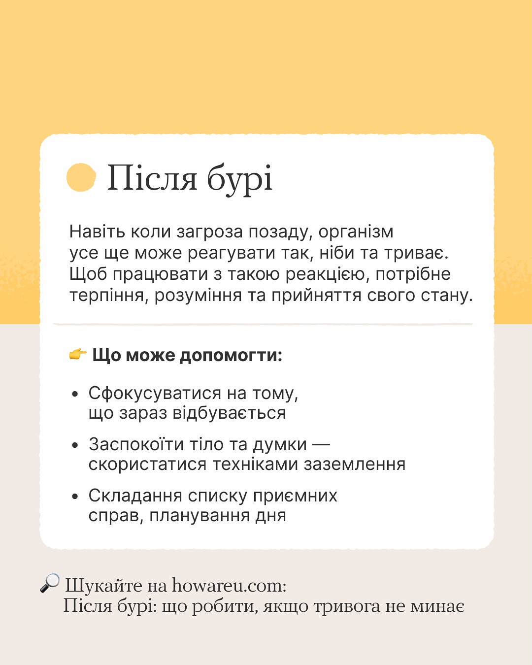На платформі «Ти як?» @howareu_program Всеукраїнської програми ментального здоров’я є орієнтири, які помічні у цьому — алгоритми самодопомоги під час кризи, після бурі та на шляху відновлення.
