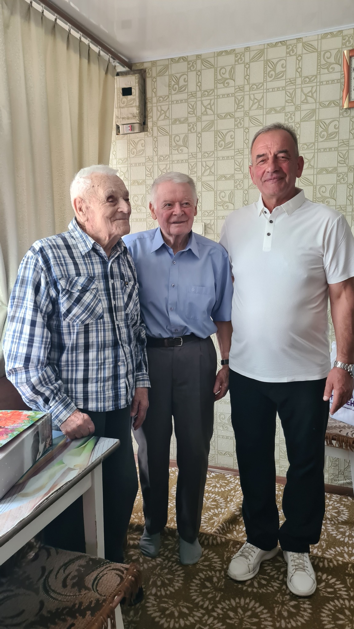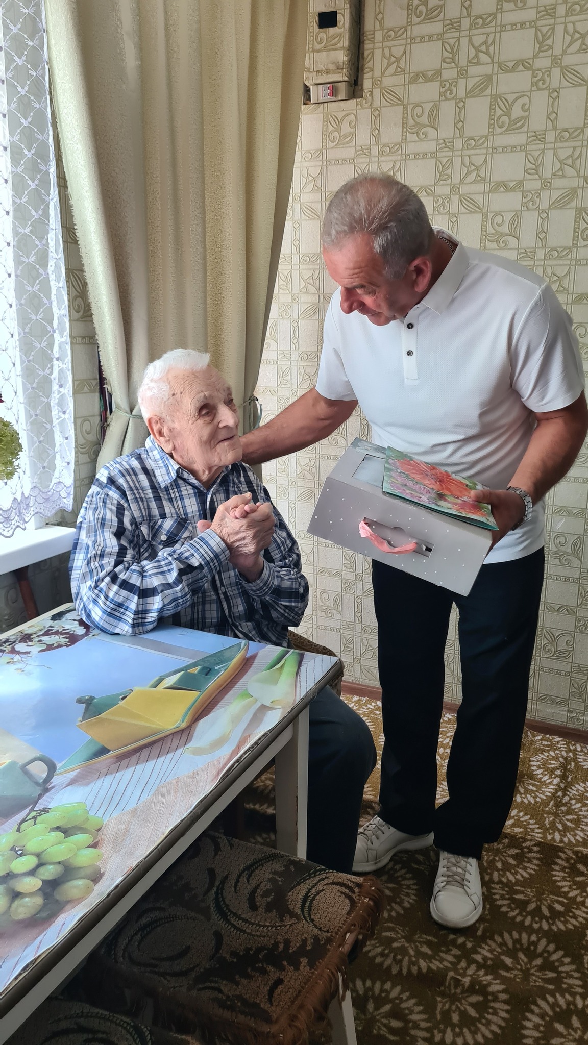 💐🎁 З цим визначним днем ювіляра привітали селищний голова Анатолій ОЛІЙНИК та голова ради ветеранів Василь СМІШКО. Вони висловили найщиріші побажання миру, незламного здоров’я, родинного затишку та безмежного щастя Володимиру Авксентійовичу. Його довге життя є свідченням стійкості та незламного духу.