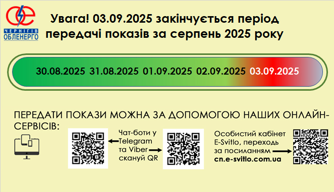 Шановні мешканці! Нагадуємо, що сьогодні, 3 вересня, останній день для передачі показів ваших електролічильників за серпень. Не втрачайте можливість вчасно виконати цей важливий обов’язок для коректного розрахунку спожитої електроенергії.