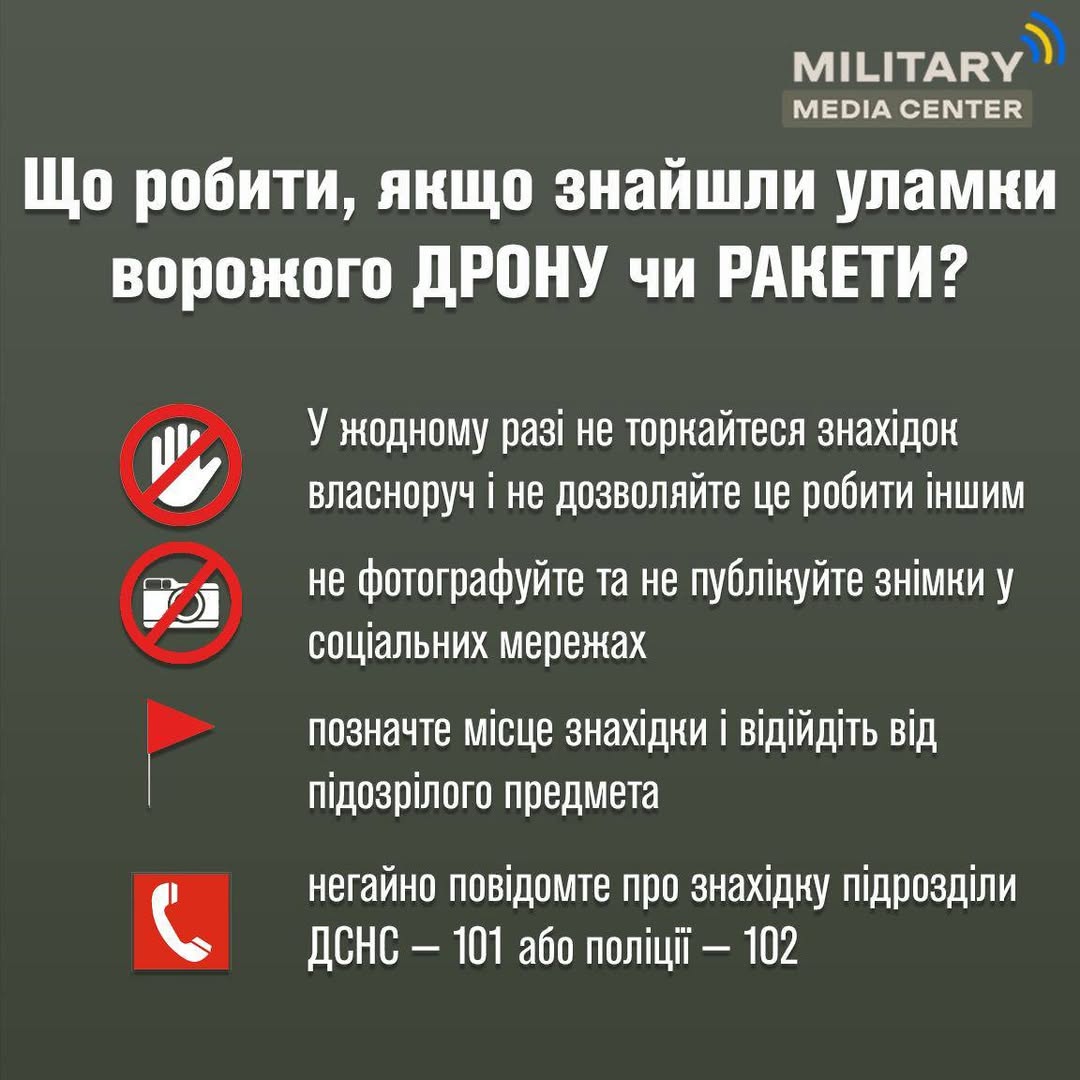 Правоохоронці застерегли громадян від самостійного збирання уламків. Категорично забороняється переміщати, розбирати їх на металолом або навіть торкатися. При виявленні підозрілих об’єктів необхідно негайно повідомляти відповідні служби. Поліція закликала представників громади проводити активну роз’яснювальну роботу серед населення, постійно нагадуючи про смертельну загрозу, яку несуть залишки збитих ворожих БПЛА.
