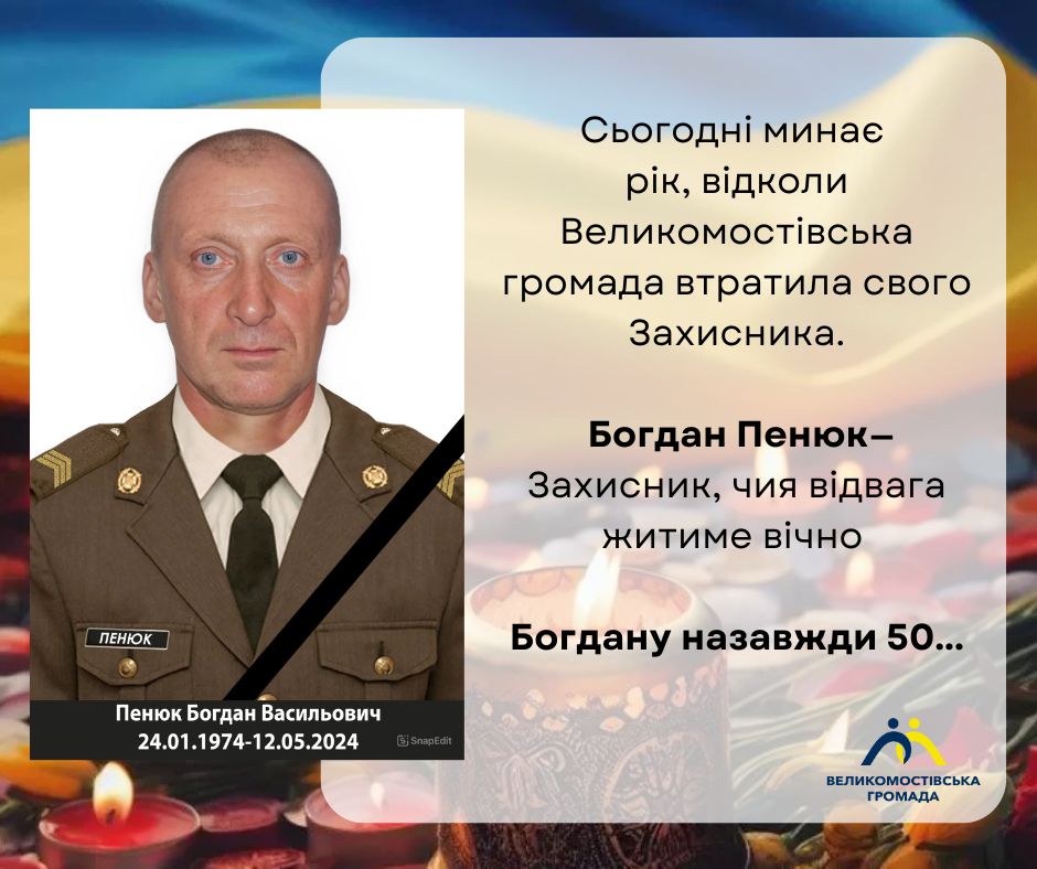 Сьогодні ми згадуємо трагічну річницю втрати нашого Героя, Богдана Пенюка. 12 травня 2024 року стало днем, коли Великомостівська громада відчула невимовний біль. Саме цього дня, виконуючи бойове завдання біля Ковалівки на Луганщині, загинув наш земляк, відважний Захисник України – Богдан Пенюк. Він віддав своє життя за мир та свободу нашої країни.