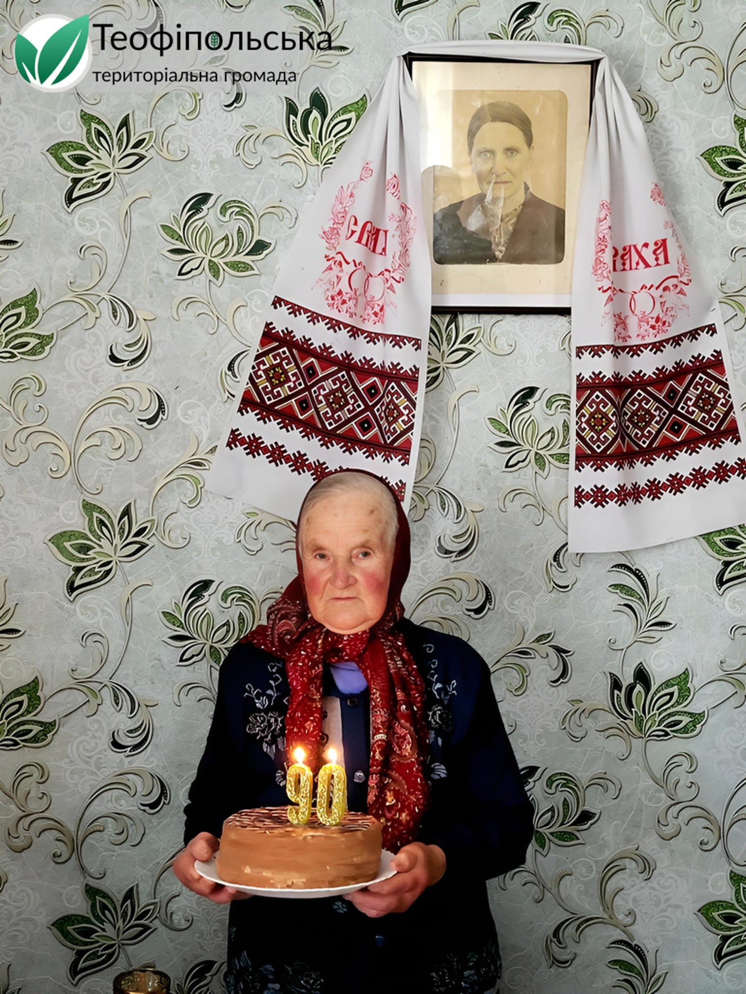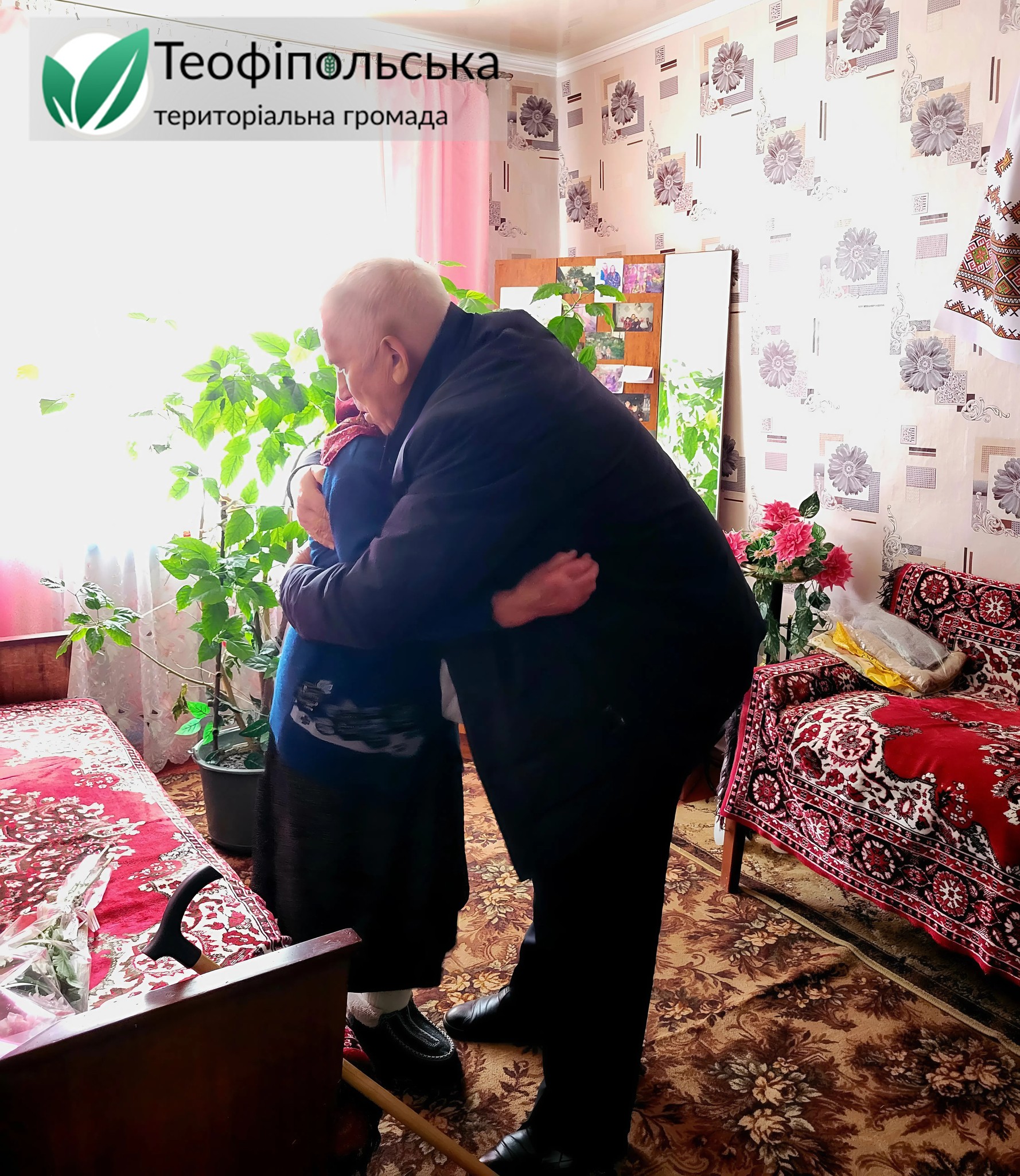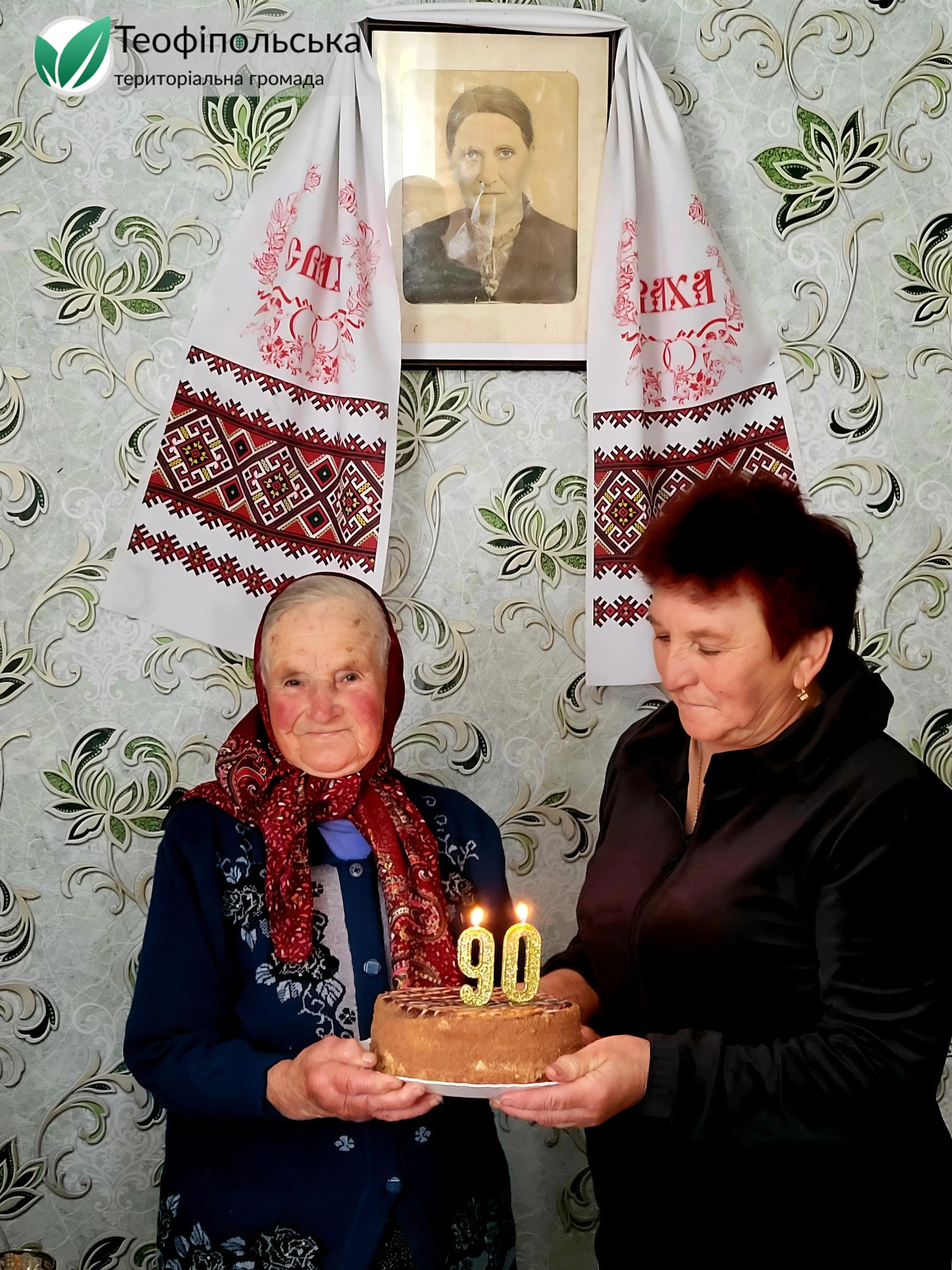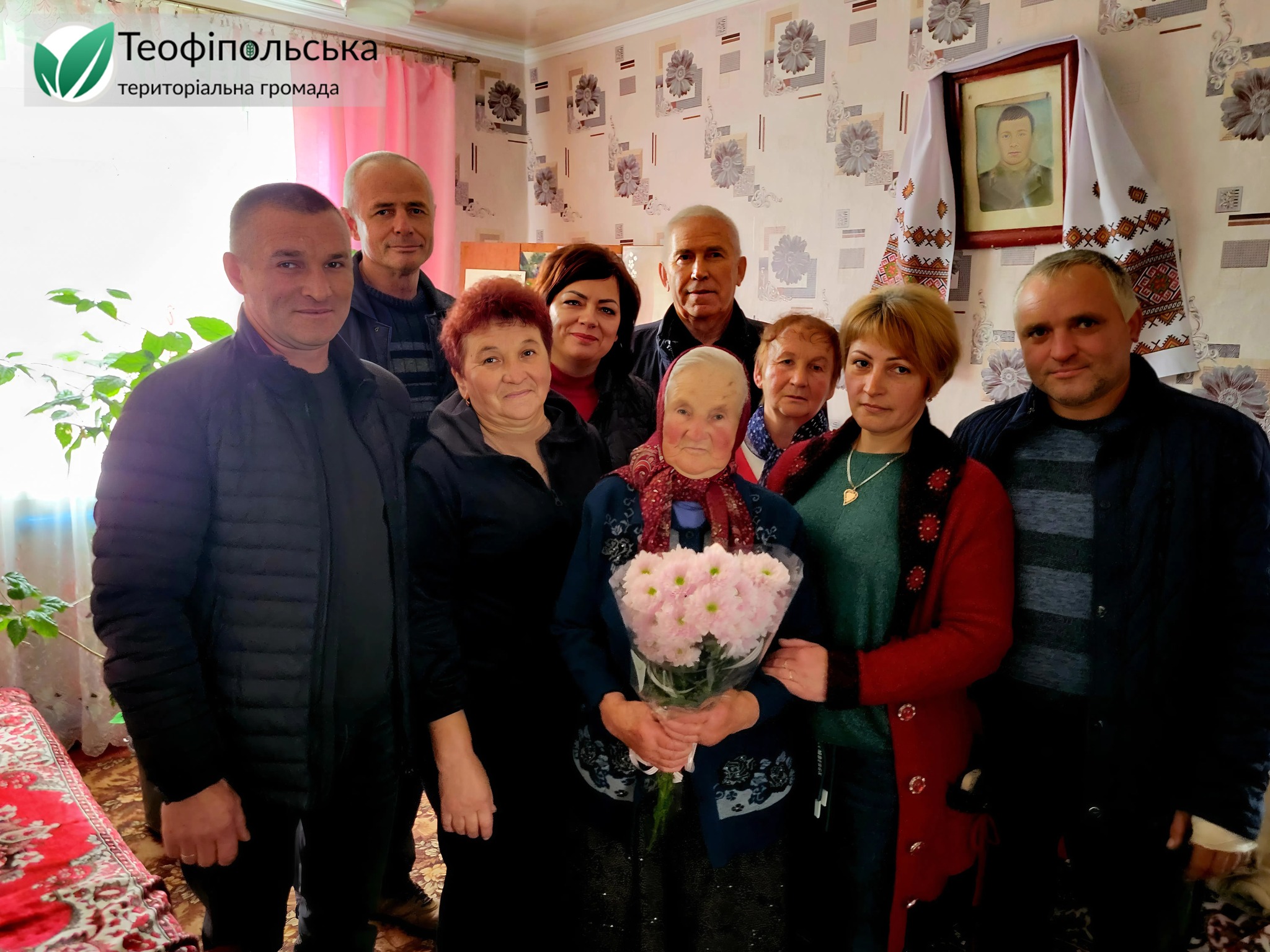 З нагоди такого знаменного ювілею, іменинницю завітали привітати офіційні представники громади: секретар селищної ради Роман Непотас, староста Карабіївського старостинського округу Ігор Мулишин та голова Відокремленого підрозділу ветеранів України Теофіпольської громади Володимир Кобера. Вони привезли з собою теплі слова та повагу від усієї громади.