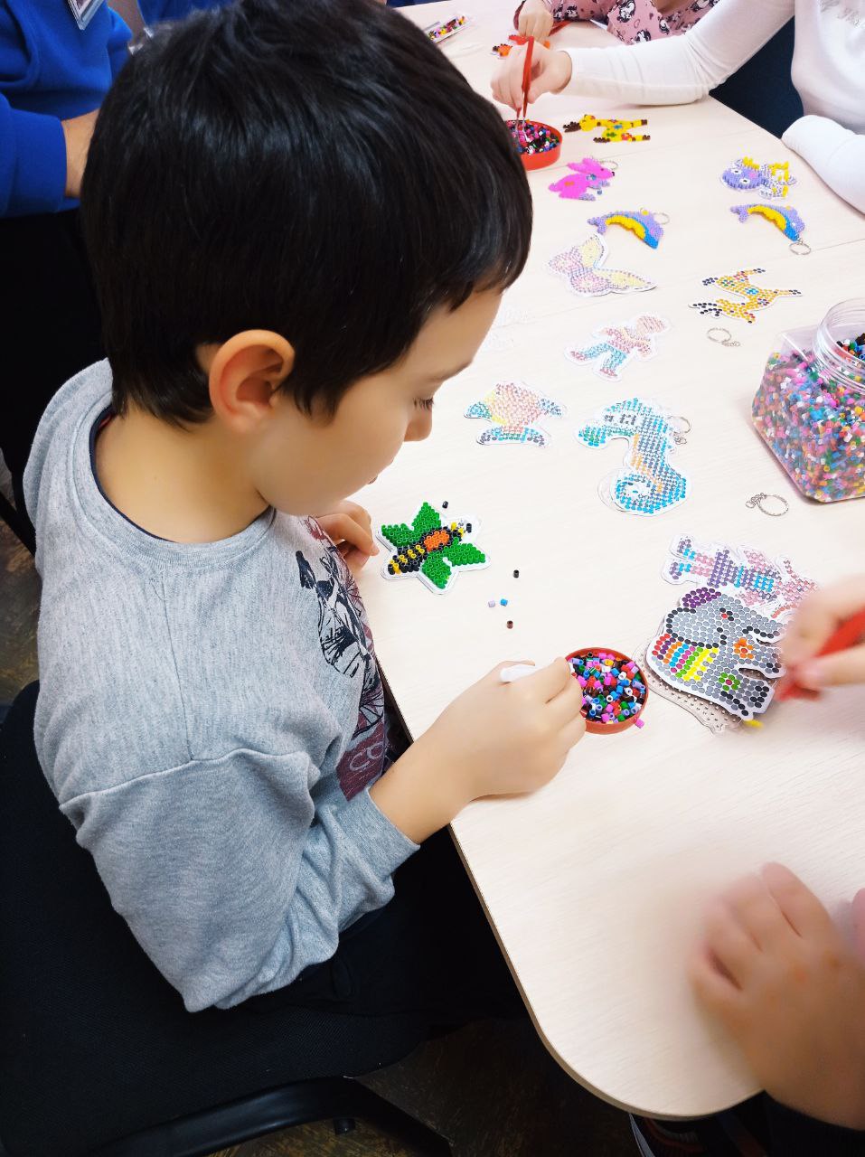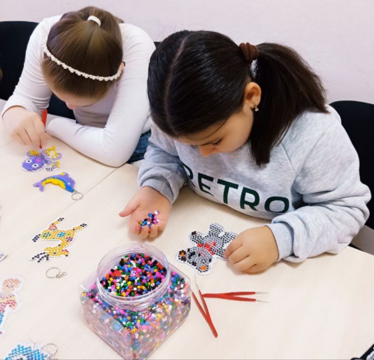 Маленькі відвідувачі з неприхованим захопленням поринули у світ мистецтва, створюючи яскраві та оригінальні брелоки з термомозаїки. Цей процес не лише розвиває дрібну моторику та креативність, але й дозволяє створити унікальний аксесуар, який буде нагадувати про радісні моменти. Майстер-клас «Мозаїчні чудеса» став справжнім відкриттям для багатьох дітей, де кожен міг проявити свою індивідуальність.