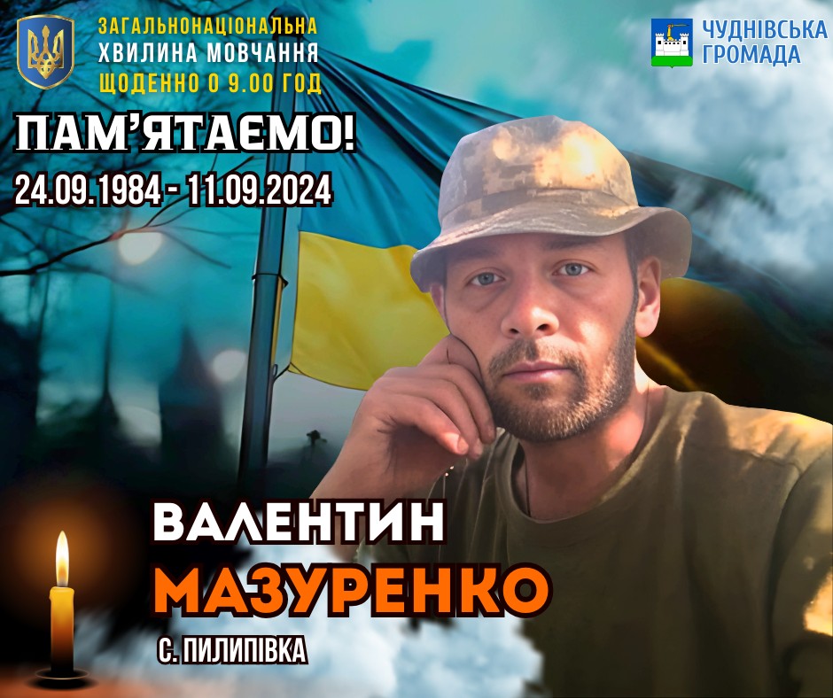 🕯 У хвилину мовчання вшануймо світлу пам’ять усіх Героїв Чуднівської громади. Вони віддали найцінніше – власне життя – задля того, аби ми могли жити у вільній, незалежній, суверенній та територіально цілісній Україні. Їхній подвиг назавжди залишиться в наших серцях. Пам’ять про захисників України, які полягли у боротьбі за нашу свободу, є тим, що об’єднує громаду і надихає на майбутнє. Кожна річниця – це нагода згадати тих, хто поклав своє життя заради майбутніх поколінь, і подякувати їм за можливість жити під мирним небом. Ми маємо пам’ятати кожного, хто віддав своє життя за нашу свободу. Їхній внесок у нашу незалежність неоціненний. Ця пам’ять є тим, що робить нас сильнішими і згуртованішими. Ми ніколи не забудемо подвиг Валентина Мазуренка та інших Героїв. Їхні імена назавжди вписані в історію України золотими літерами. Наша пам’ять про них – це наш обов’язок перед майбутнім.