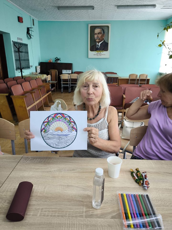 Крім того, психолог провела цікаве творче завдання. Кожен учасник мав можливість обрати картинку, яка найбільше резонувала з його внутрішнім світом, та розмалювати її. Цей процес дозволив висловити власні почуття та настрій через мистецтво, надавши можливість для самопізнання та рефлексії. Такі арт-терапевтичні методики позитивно впливають на психологічний стан та сприяють емоційному благополуччю. Заняття в Моршинській школі мистецтв стали важливим кроком у підтримці активного та повноцінного життя для бенефіціарів HelpAge, демонструючи ефективність комплексного підходу до соціальної адаптації та розвитку.