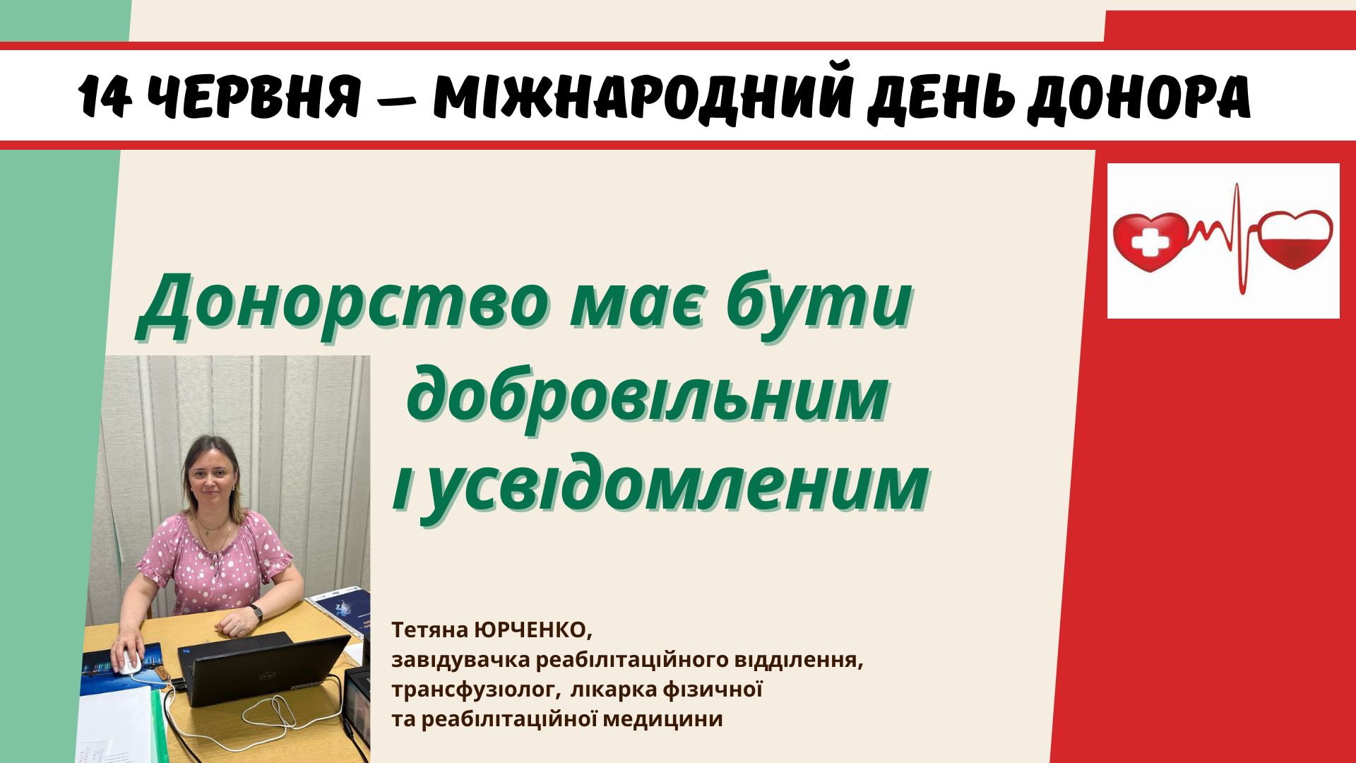 Сьогодні, 14 червня, відзначаємо Міжнародний день донора крові – свято людей, які добровільно діляться своєю кров’ю, щоб врятувати життя інших. Ми поговорили з Тетяною Юрченко, завідувачкою реабілітаційного відділення, трансфузіологом та лікаркою фізичної і реабілітаційної медицини, про важливість донорства, зміни в системі охорони здоров’я та її особистий досвід.