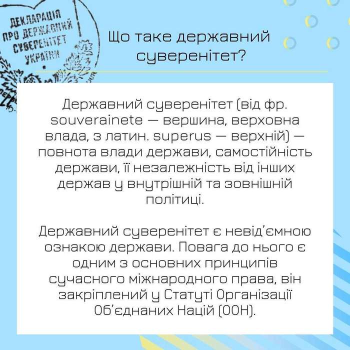3. У преамбулі Декларації підкреслювалося, що Верховна Рада УРСР проголошує суверенітет України як «верховенство, самостійність, повноту і неподільність влади республіки в межах її території, незалежність і рівноправність у зовнішніх зносинах».