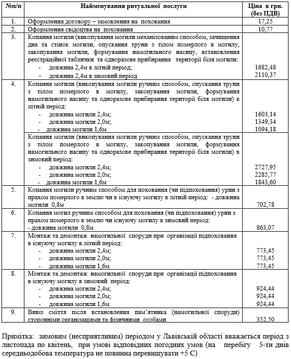 До переліку затверджених ритуальних послуг входять: оформлення договору-замовлення на поховання, оформлення свідоцтва про поховання, копання могили вручну або механізованим способом у літній та зимовий періоди (включаючи опускання труни, засипання, формування насипу та одноразове прибирання території), копання могили для поховання урни з прахом, монтаж і демонтаж намогильних споруд, а також вивезення сміття після встановлення надмогильних споруд сторонніми організаціями. Вартість кожної з цих послуг тепер регулюється новими тарифами, затвердженими виконкомом.