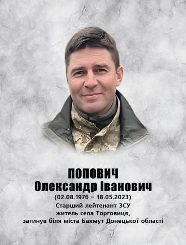 Сьогодні минає друга річниця з дня, коли в запеклих боях за Бахмут, віддано захищаючи Україну, загинув старший лейтенант Попович Олександр Іванович. Він був командиром кулеметного взводу 2 стрілецької роти військової частини А4809, мешканцем села Торговиця, 1976 року народження.