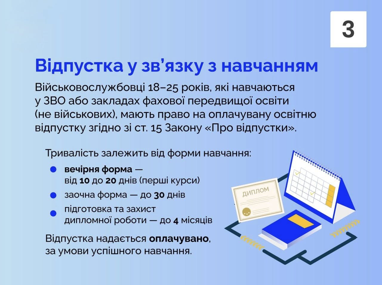 🔹 Надання навчальної відпустки для здобуття освіти у вищих навчальних закладах або фахових передвищих закладах освіти.