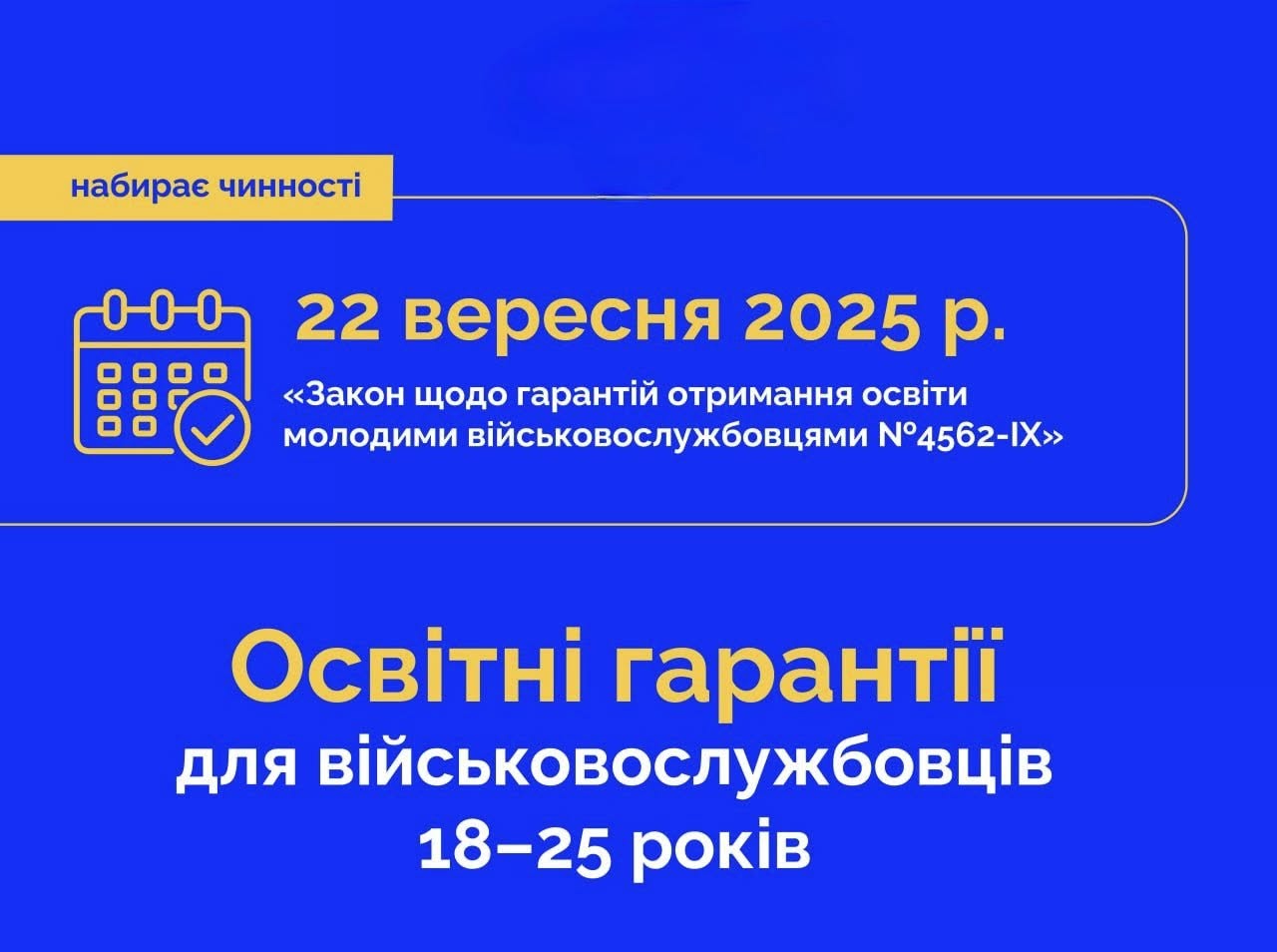 З 22 вересня набуває чинності важливий Закон № 4562-IX, який встановлює нові освітні гарантії для молодих військовослужбовців віком від 18 до 25 років. Цей закон покликаний підтримати захисників України, надавши їм можливість продовжувати навчання та розвиватися професійно навіть під час несення служби. Це значно підвищить мотивацію до контрактної служби та сприятиме їхньому подальшому кар’єрному зростанню. Закон дає молоді можливість не втрачати зв’язок з освітою навіть під час служби, підвищує мотивацію до контрактної служби, сприяє подальшому професійному розвитку, зменшує ризик втратити академічний прогрес через військові обов’язки.