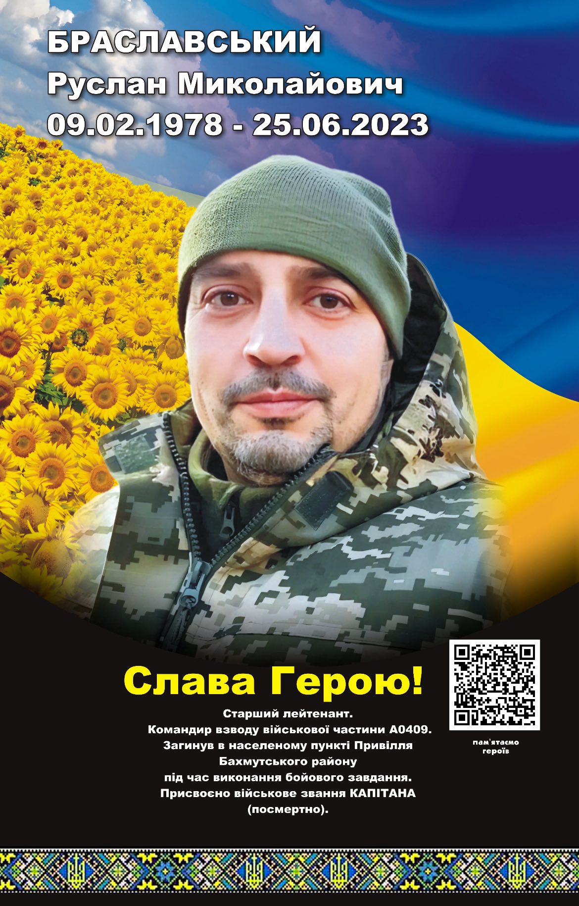 25 червня 2023 року біля населеного пункту Привілля Соледарської міської громади Бахмутського району Донецької області, виконуючи бойове завдання, старший лейтенант Браславський Руслан Миколайович загинув смертю хоробрих за