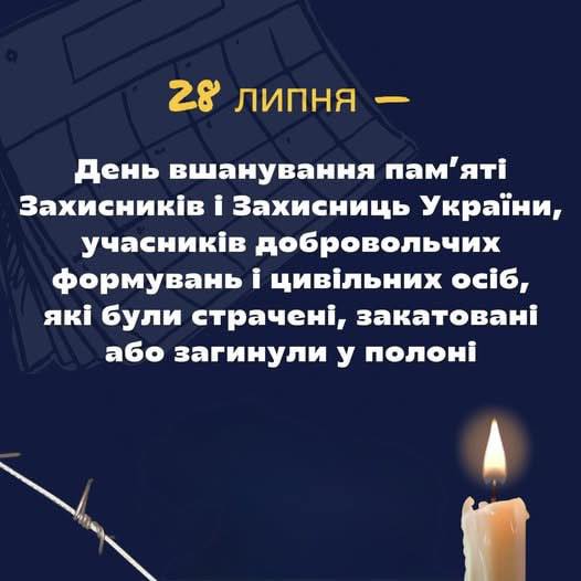 🔰 28 липня – це особливий день для України, адже вперше вшановується пам’ять Захисників і Захисниць України. Цей день присвячений не лише військовим, але й учасникам добровольчих формувань, а також цивільним особам, які зазнали жорстоких репресій, тортур чи загинули в полоні. Це день глибокої поваги та невдячності до всіх, хто віддав своє життя за свободу та незалежність нашої Батьківщини.