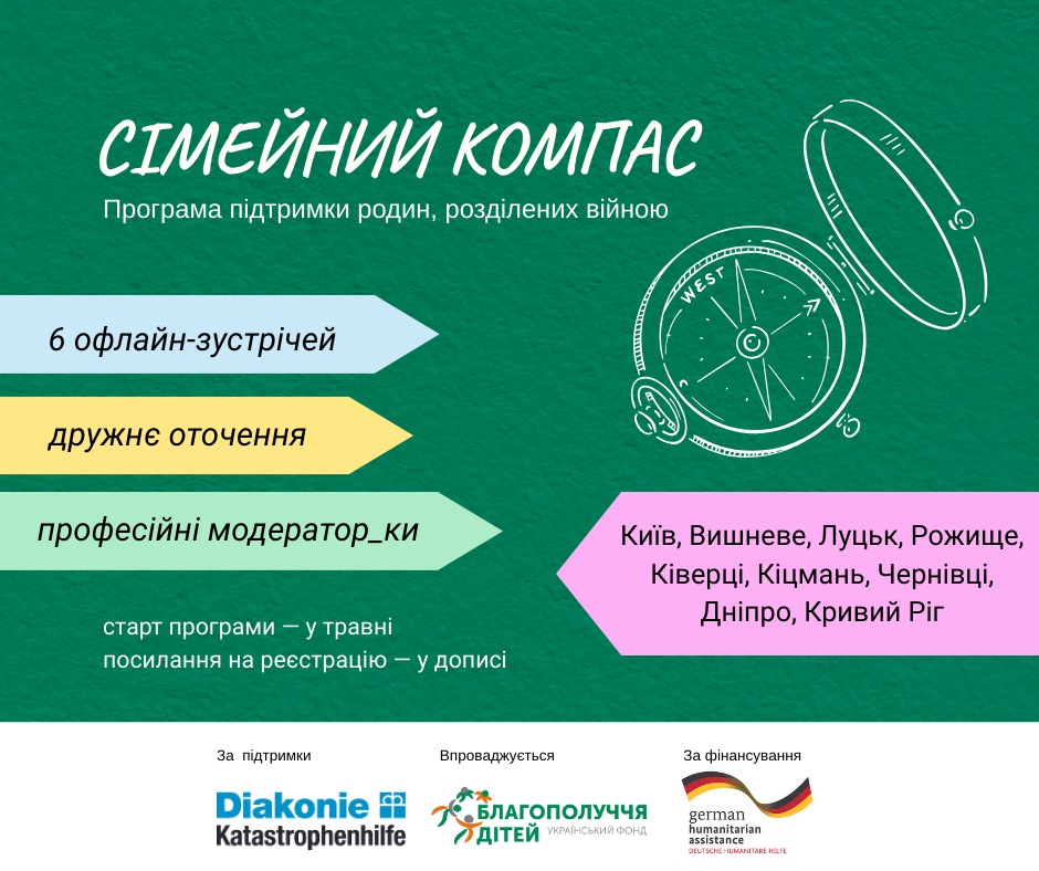 Психоедукаційну програму «Сімейний компас» упроваджує Український фонд «Благополуччя дітей» у партнерстві з Diakonie Katastrophenhilfe за фінансування Міністерства закордонних справ Німеччини.