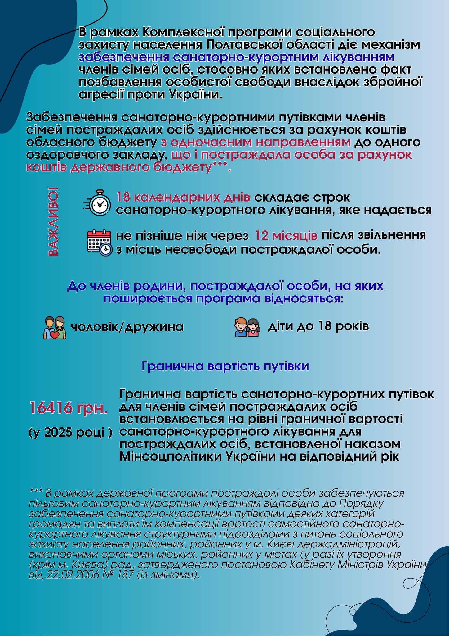 На обласному рівні запроваджено додаткові соціальні гарантії для посилення ефективності реабілітації постраждалих та відновлення їхніх соціальних і сімейних зв’язків. Людмила Корнієнко, директор Департаменту соцзахисту населення ПОВА, зазначила: «Відповідно до заходів Комплексної програми соціального захисту населення Полтавської області, створено можливість одночасного санаторно-курортного лікування для членів сімей громадян, які повернулися з російського полону, за кошти обласного бюджету. На реалізацію цього напрямку у поточному році планується спрямувати 1,2 млн. грн. з обласного бюджету, що дозволить охопити послугами санаторно-курортного лікування 73 членів сімей постраждалих осіб».
