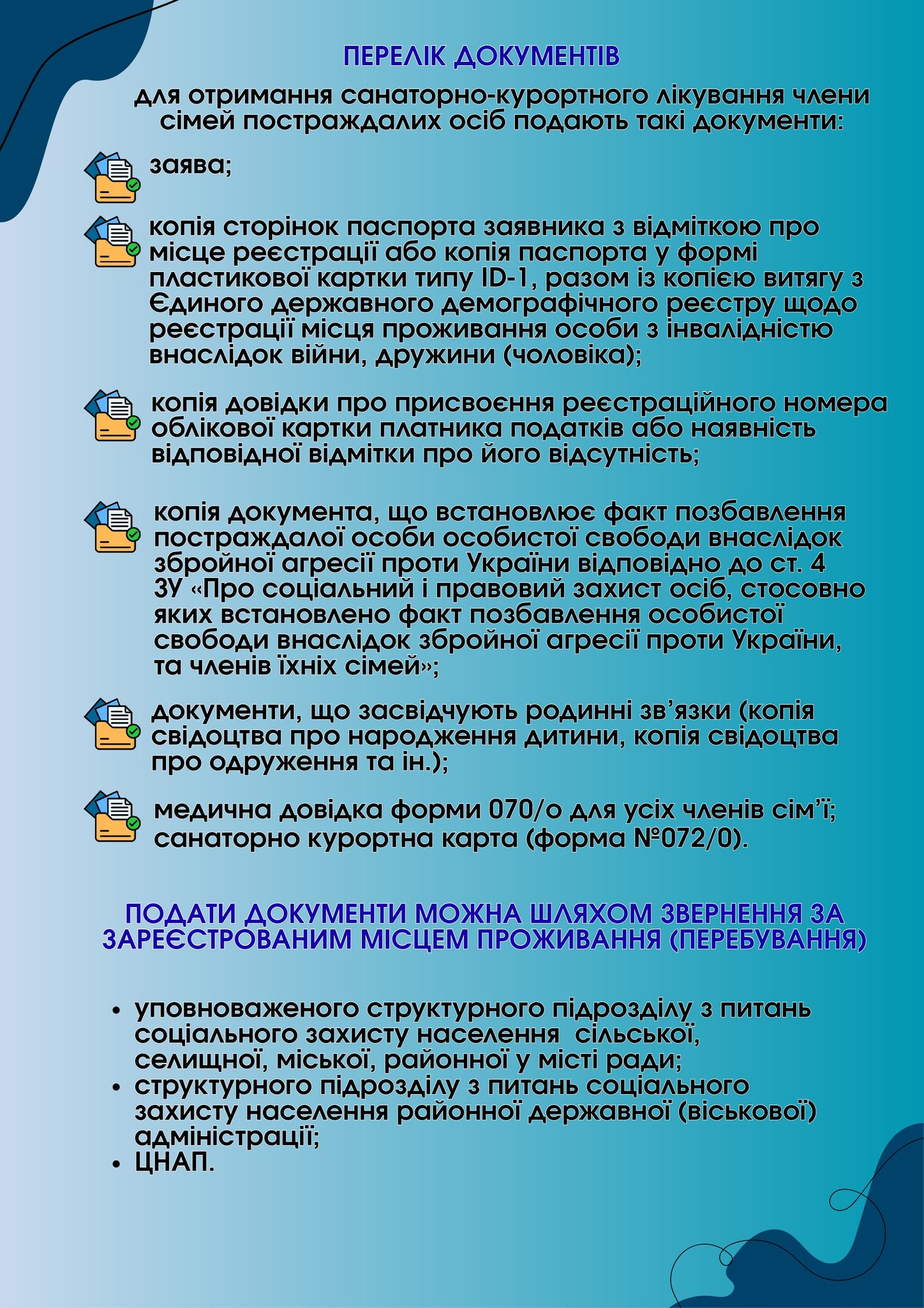 Для отримання послуг санаторно-курортного лікування необхідно звернутися до виконавчого органу сільської, селищної, міської ради або районної військової адміністрації, районного управління соціального захисту населення за місцем проживання.