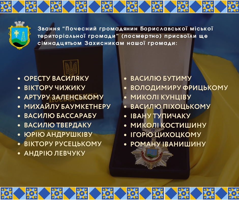 Імена цих відважних захисників навіки будуть закарбовані у Книзі почесних громадян Бориславської громади. Це є символом вічної пам’яті та вдячності за їхній неоціненний внесок у боротьбу за свободу України. Нагрудні знаки почесних громадян Бориславської громади будуть передані родинам загиблих воїнів.