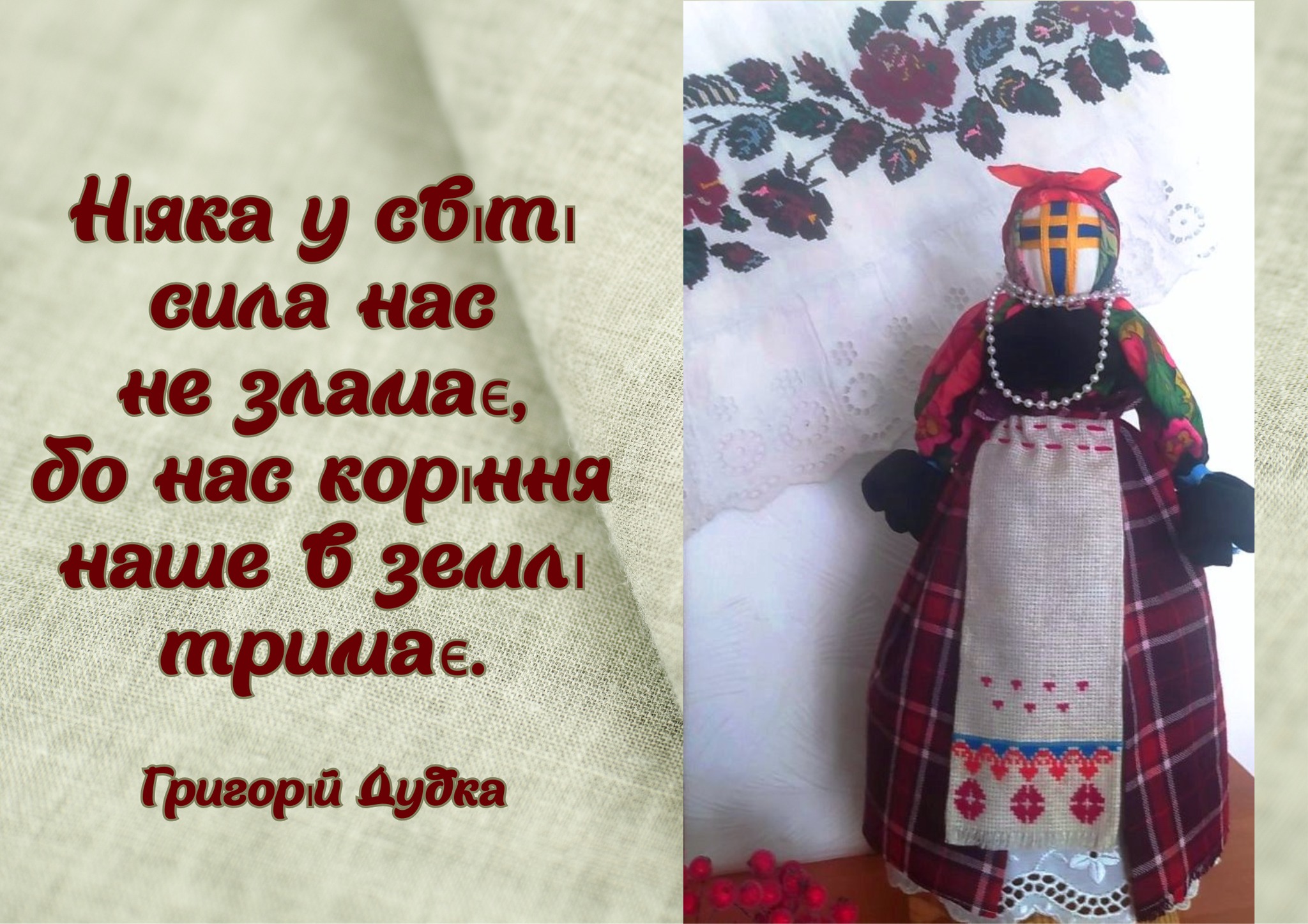 🌻Сьогодні в нашій липневій рубриці — витвір народної душі, лялька-мотанка, створена руками Людмили Шапарчук з влучною мудрістю Григорія Дудки «Ніяка у світі сила нас не зламає, бо нас коріння наше в землі тримає»