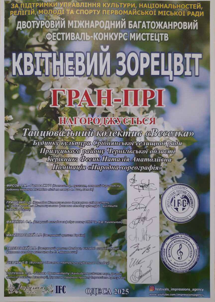 Танцювальний колектив «ВЕСЕЛКА» Срібнянської селищної ради, під керівництвом Наталії Фесик, став тріумфатором Міжнародного багатожанрового фестивалю-конкурсу мистецтв «Квітневий зорецвіт», що проходив у два тури. Їх талант та майстерність були високо оцінені професійним журі. У номінації «Народна хореографія» колектив отримав найвищу нагороду – «ГРАН-ПРІ». Ця перемога є результатом наполегливої праці, відданості танцю та любові до української культури.