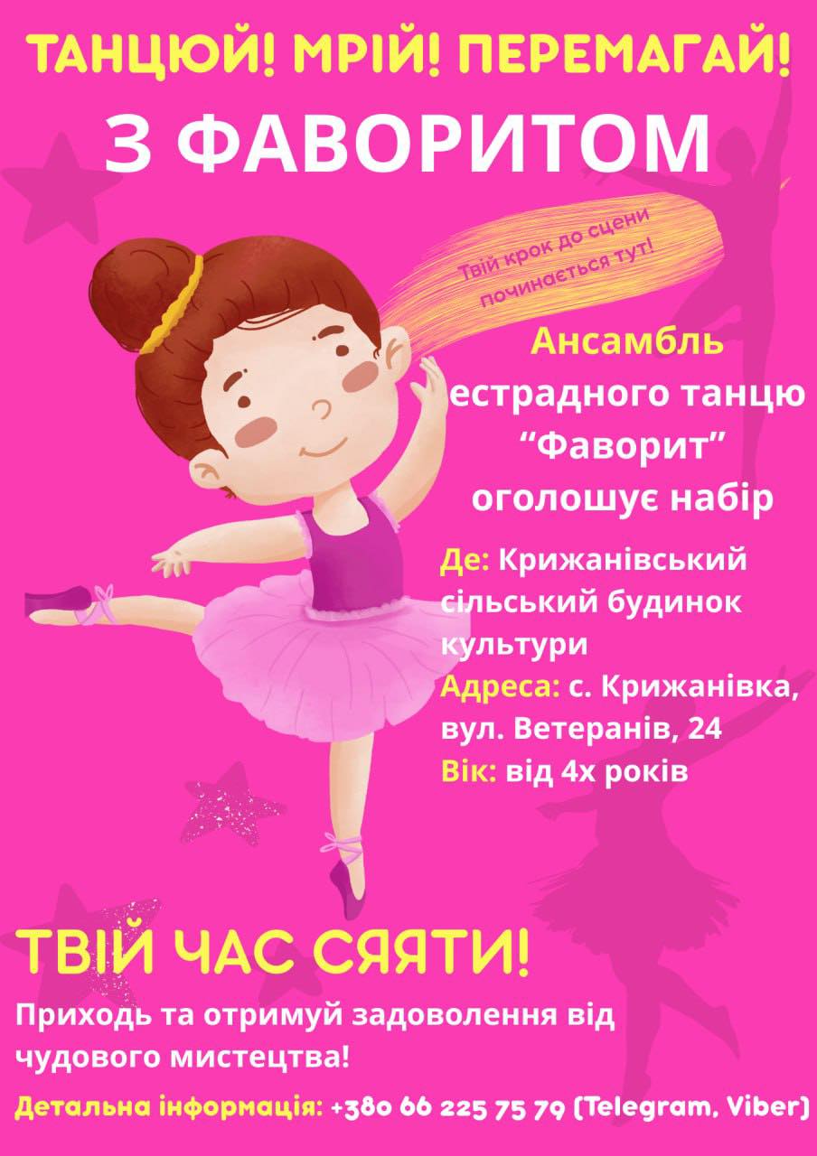 💃✨ Танцюй! Мрій! Перемагай! Ансамбль естрадного танцю «Фаворит» запрошує дітей віком від 4 років на захопливі заняття!