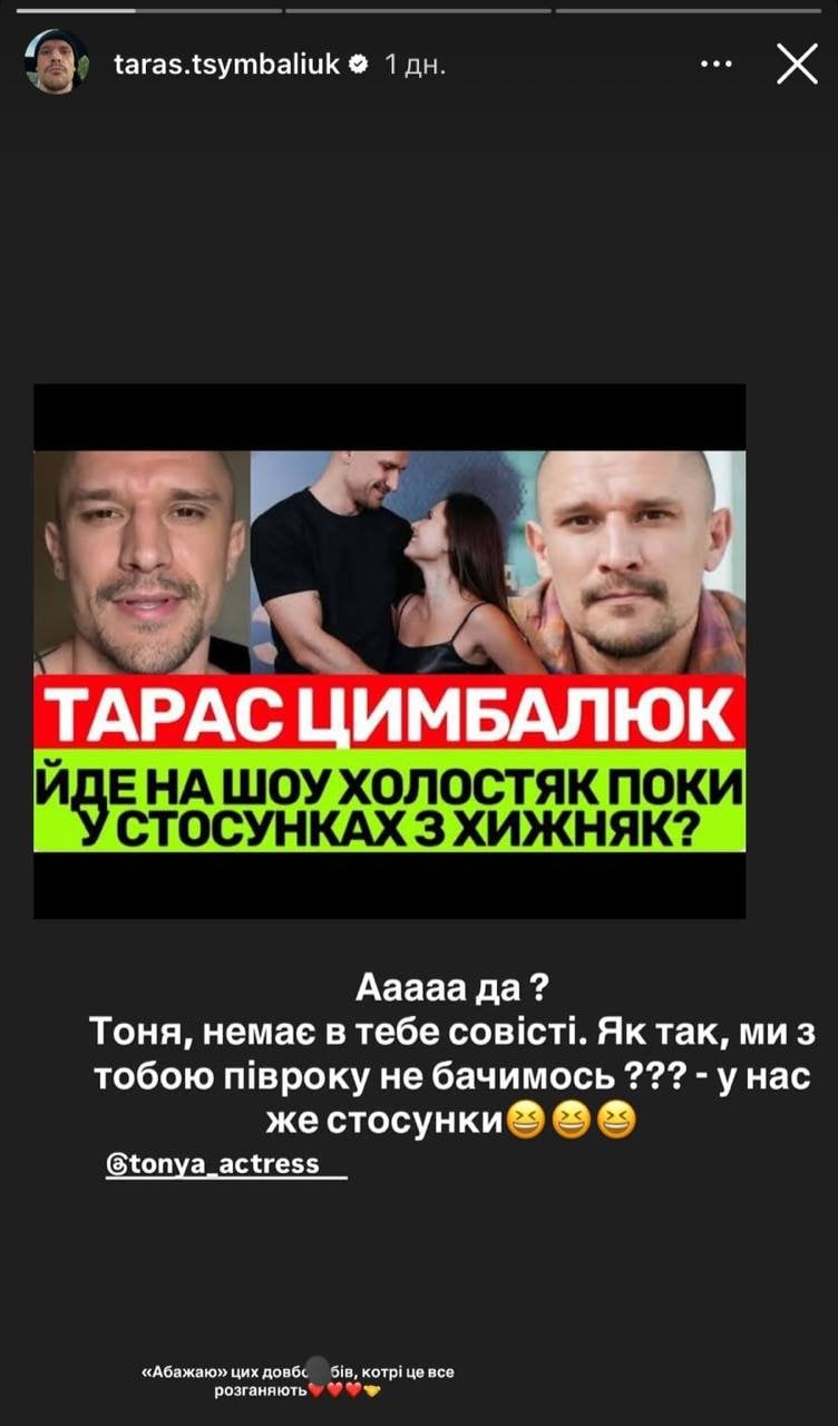 Звісно, сам Тарас Цимбалюк не міг залишити таку інформацію без уваги. Актор, відомий своїм почуттям гумору та іронією, відреагував на ці чутки у притаманній йому манері. Він публічно звернувся до Антоніни Хижняк, жартівливо дорікнувши їй у «відсутності совісті» та зазначивши, що вони вже пів року не бачилися, хоча, згідно з чутками, мали б бути у стосунках. Цей коментар викликав посмішку у шанувальників та чітко дав зрозуміти, що романтичного зв’язку між акторами немає.