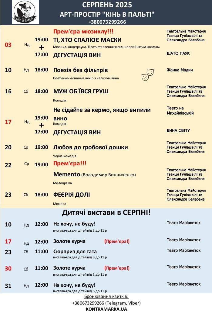 Театральний арт-простір КІНЬ В ПАЛЬТІ пропонує вашій увазі в серпні вистави для вечірнього перегляду та для наших маленьких глядачів від 3 до 12 років!🎭