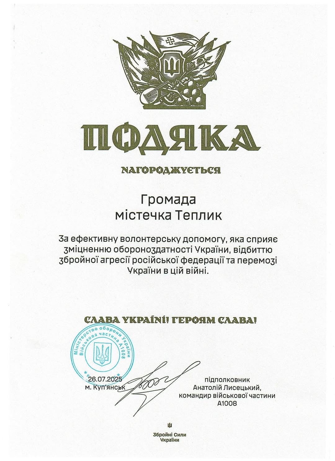 Теплицька громада отримала подяку від військової частини 14-тої окремої механізованої бригади імені князя Романа Великого.