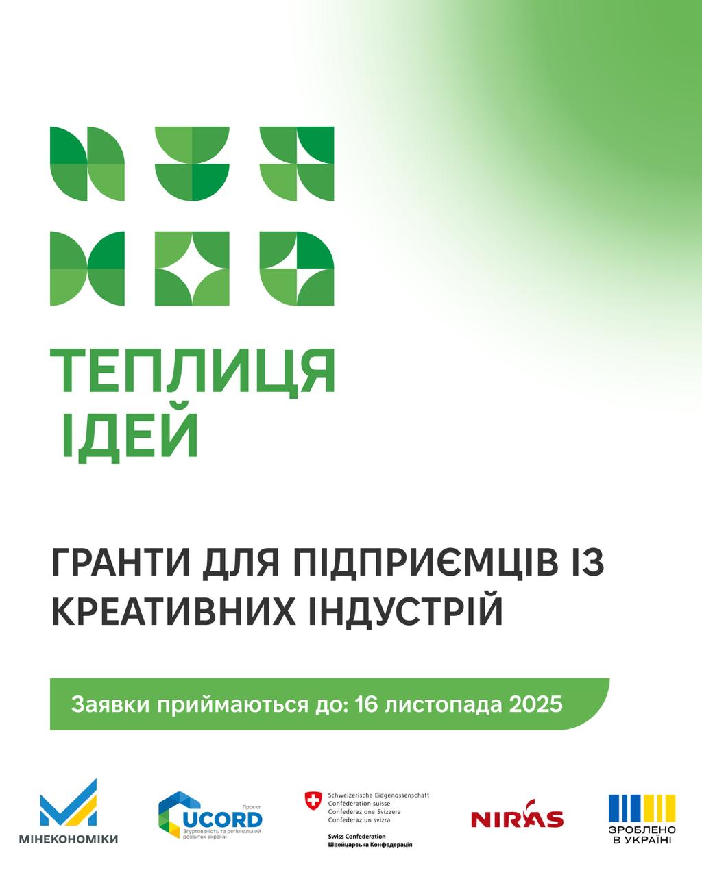 📢 «Теплиця ідей»: старт прийому заявок на грантову програму від Мінекономіки та Проєкту UCORD для підтримки креативного підприємництва.